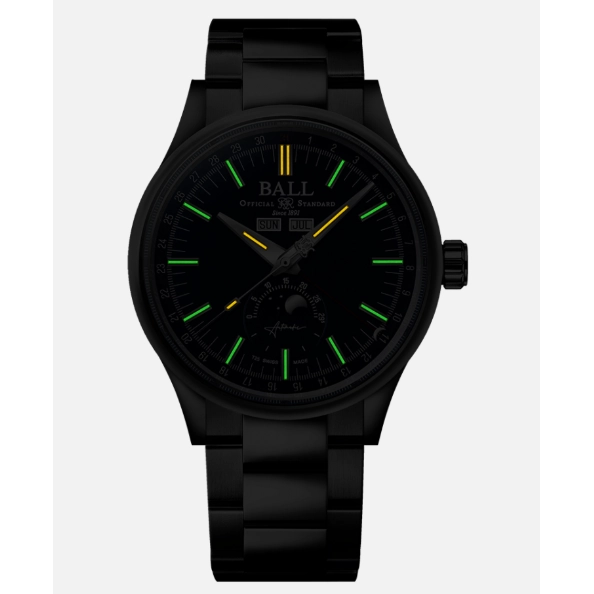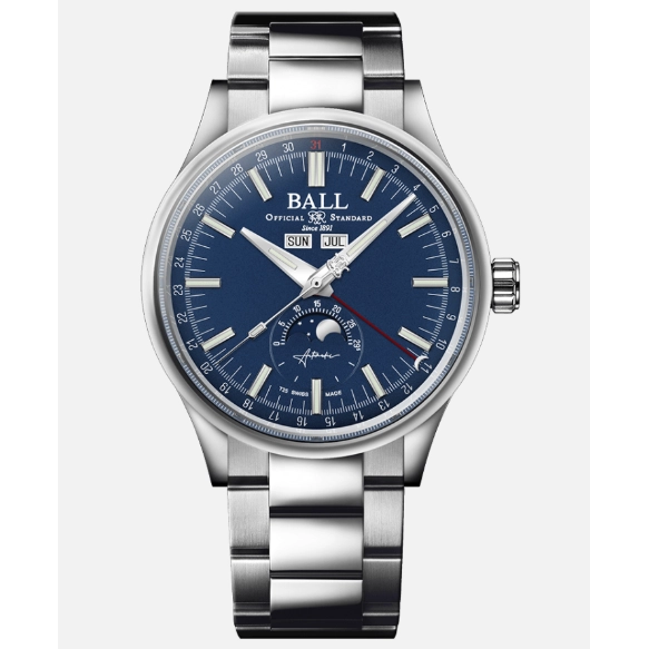 Ball Watch. Engineer II Moon Calendar. Limited Edition of 1000 pieces. Stainless steel case and bracelet. 40mm case. Blue dial. Synthetic sapphire crystal. Swiss automatic movement. Exhibition caseback. Moon phase. Month, day, and date. Amortiser Anti-Shock.