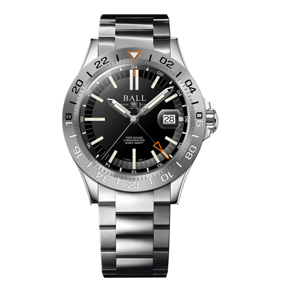 Ball watch. Engineer III Outlier GMT in stainless steel case and bracelet. Synthetic sapphire crystal. 40mm case. Black dial with orange GMT hand and micro gas tubes. 24-hour bezel. Swiss automatic movement. Limited Edition of 1000 pieces.