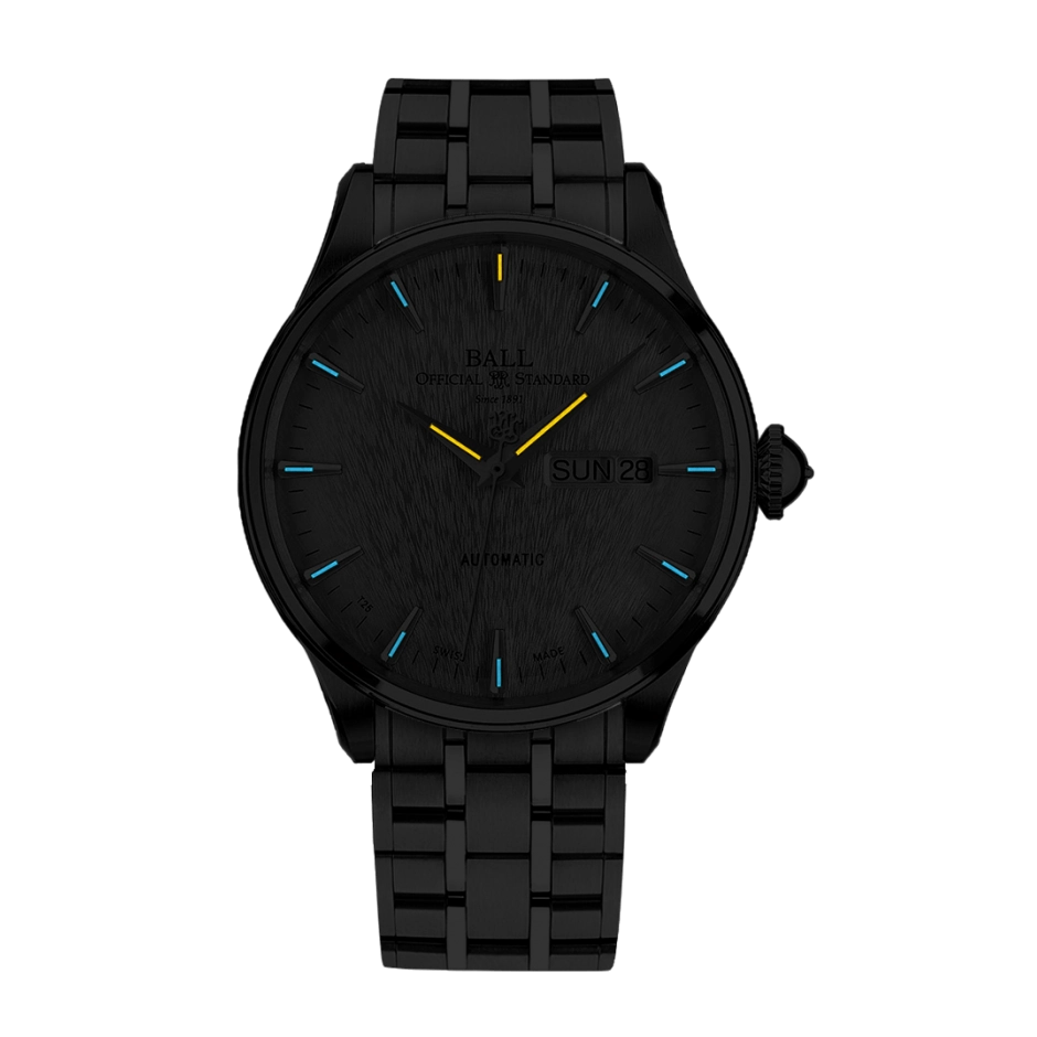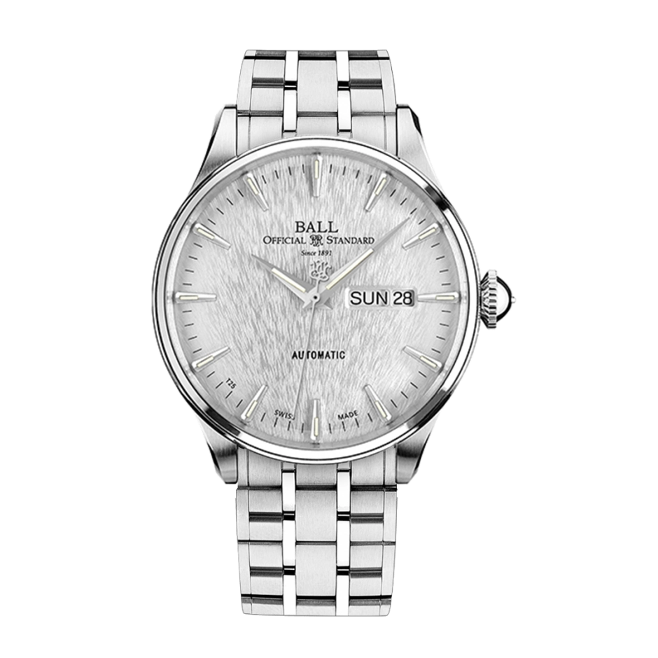 Ball watch. Trainmaster Eternity in stainless steel case and bracelet. Synthetic sapphire crystal. 39.5mm case. Silver dial with micro gas tubes. Swiss automatic movement. Day. Date.