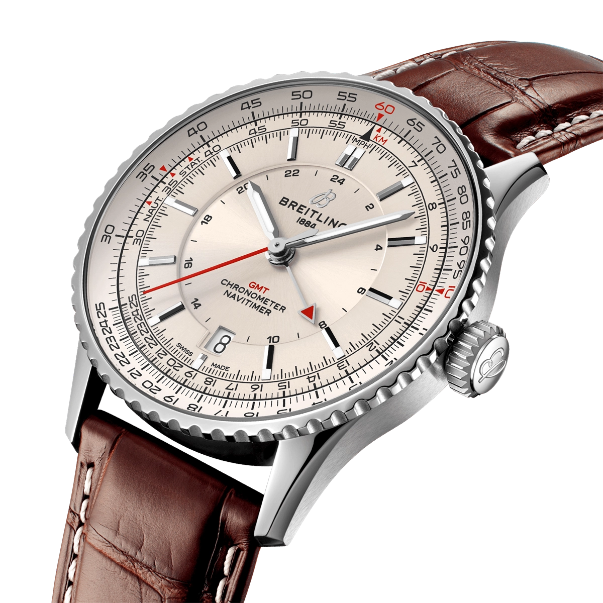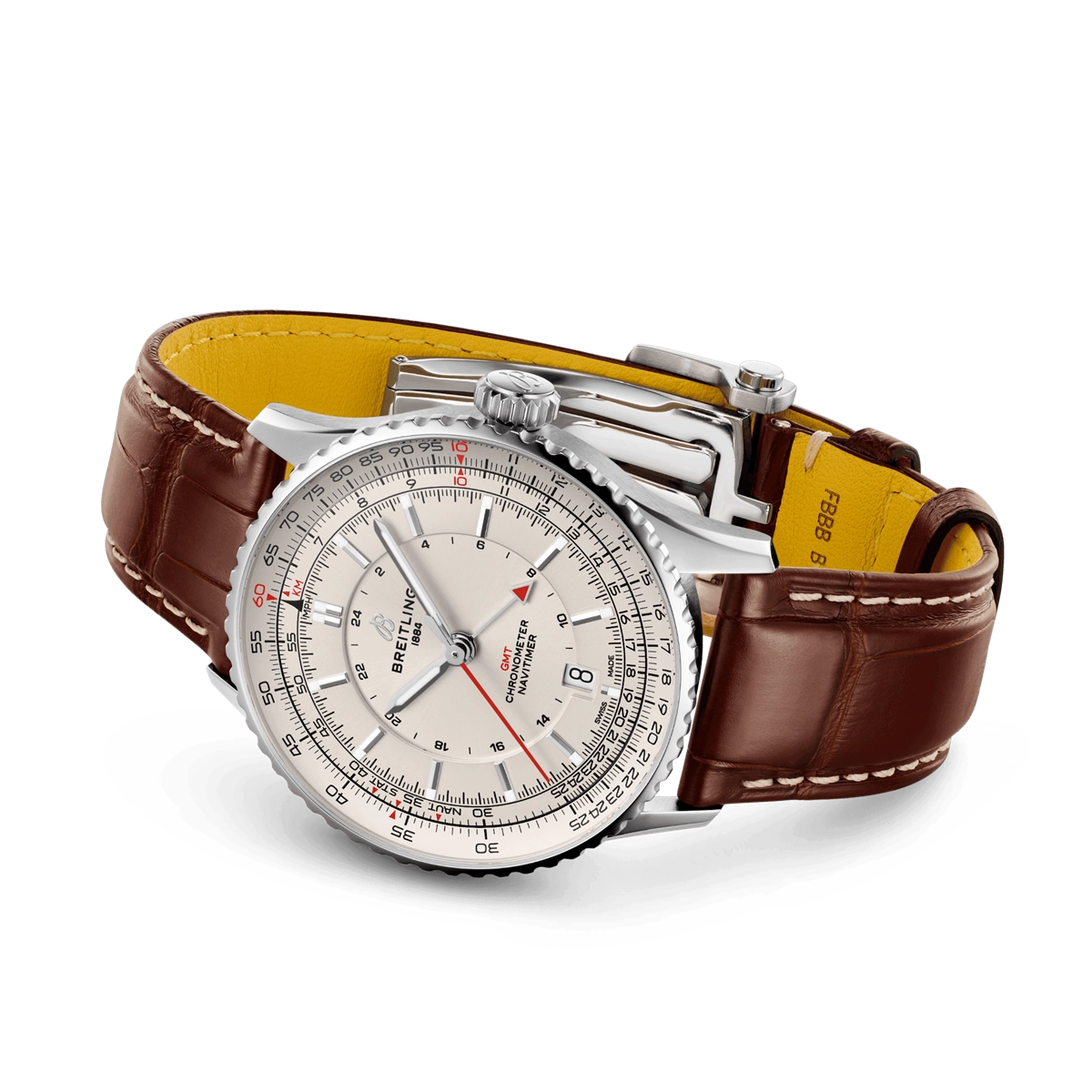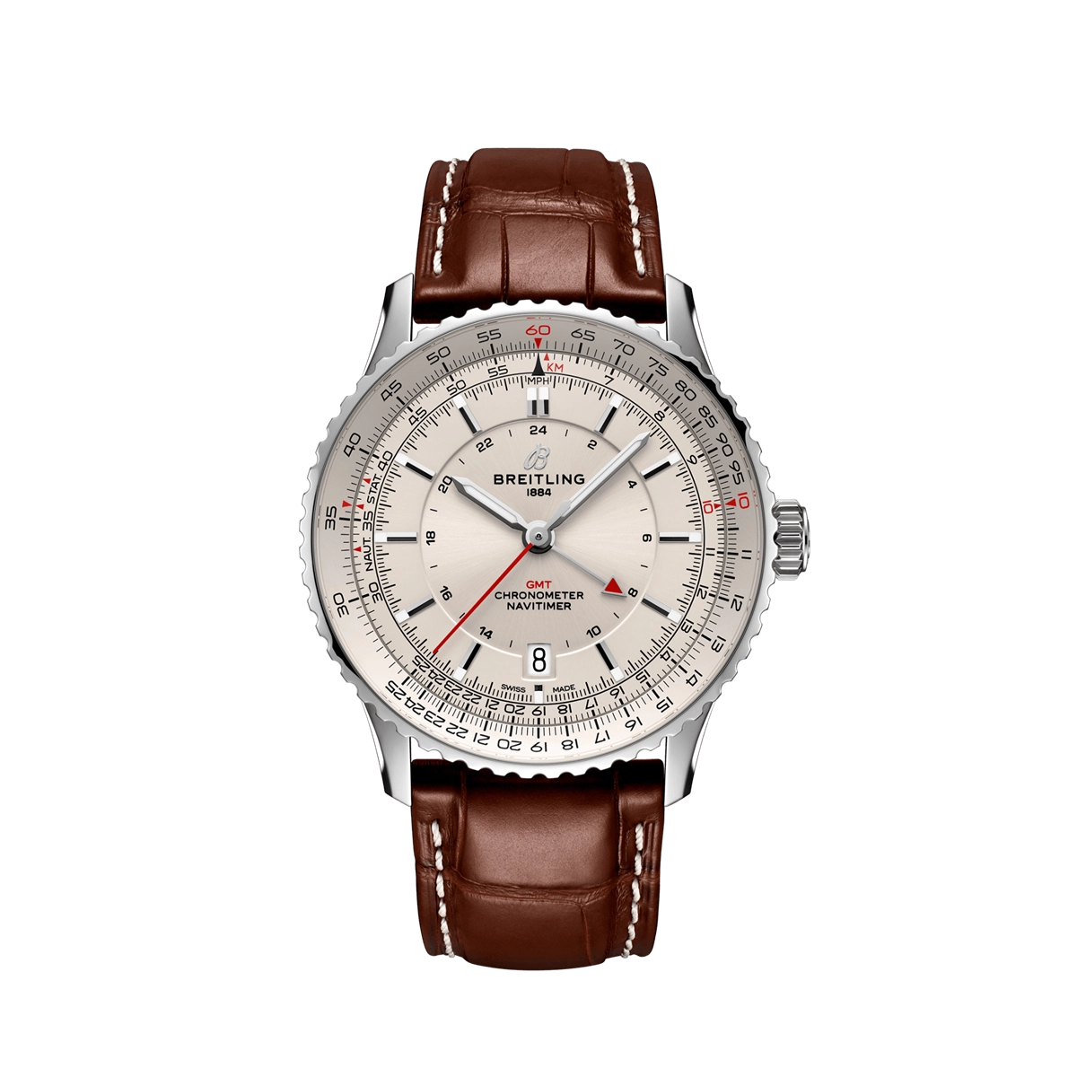 Breitling watch. Navitimer GMT 41 in steel. Synthetic sapphire crystal. 41mm case. Cream dial with GMT hand. Circular slide rule bezel. Brown alligator leather strap with folding buckle. Swiss automatic movement. Breitling caliber 32. 21 jewels. Approximately 42 hours power reserve. Date. Chronometer.