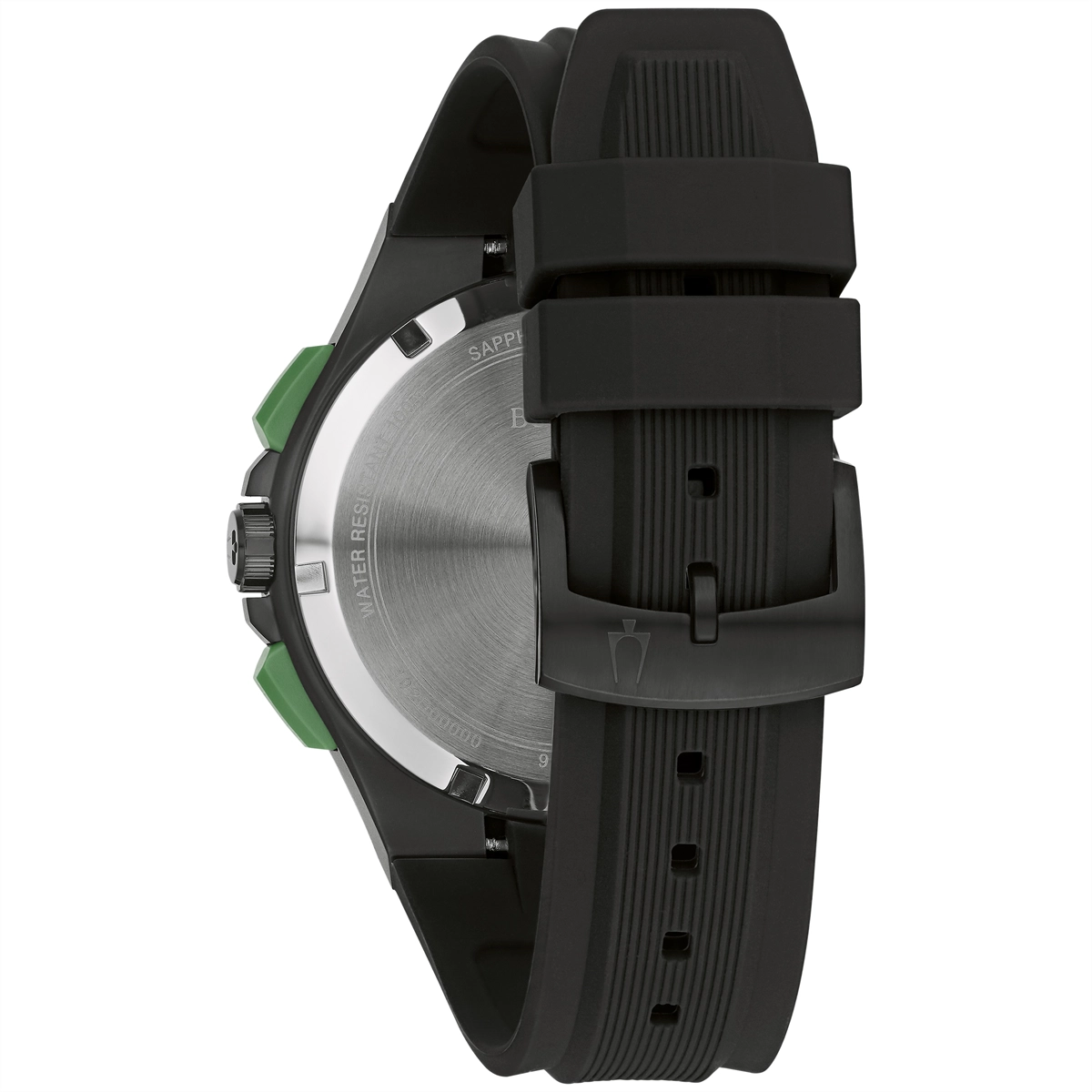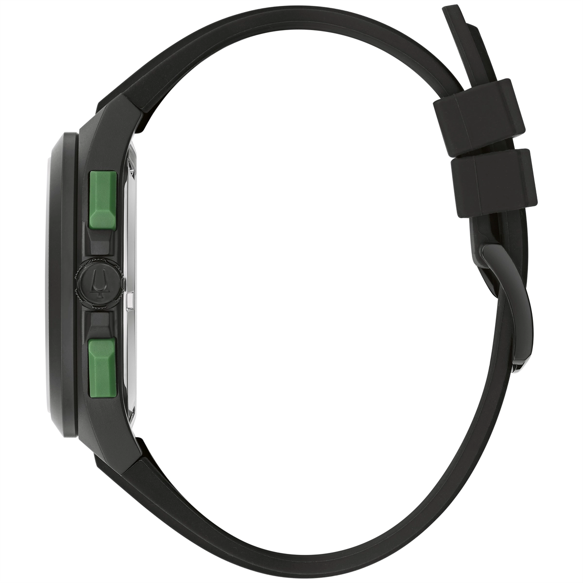 Bulova watch. Maquina Sport in black ion-plated stainless steel case. Synthetic sapphire crystal. 46mm case. Dark gray and black dial with green accents. Quartz movement. Date.