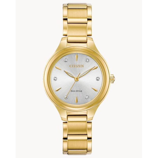 Citizen watch. Corso in gold-tone stainless steel case and bracelet. Mineral crystal. 29mm case. Silver dial with diamond accents. Eco-Drive.