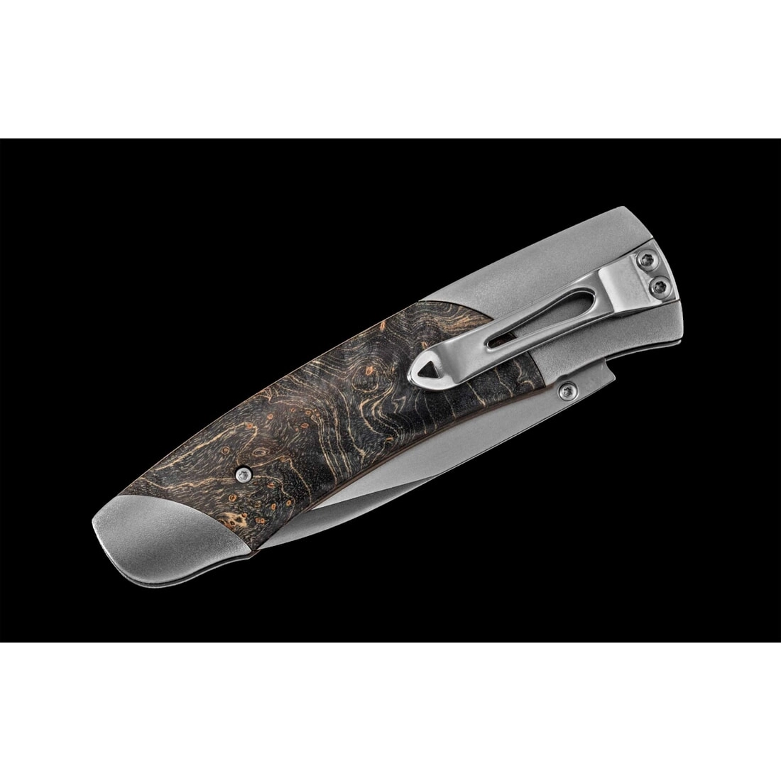 William Henry Knife. A-series model. Titanium handle inlaid with dyed grey maple burl. Stainless steel blade crafted from S35VN. Pocket clip included. *Patterns may not match photo