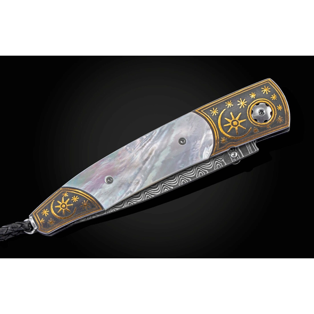 William Henry Knife. Lancet Dark Sky model. 24K gold Koftgari handle inlaid with Mother of Pearl. Hand forged "wave" damascus steel blade. One hand button lock and thumb stud set with spinel gemstones. *Patterns may not match photo