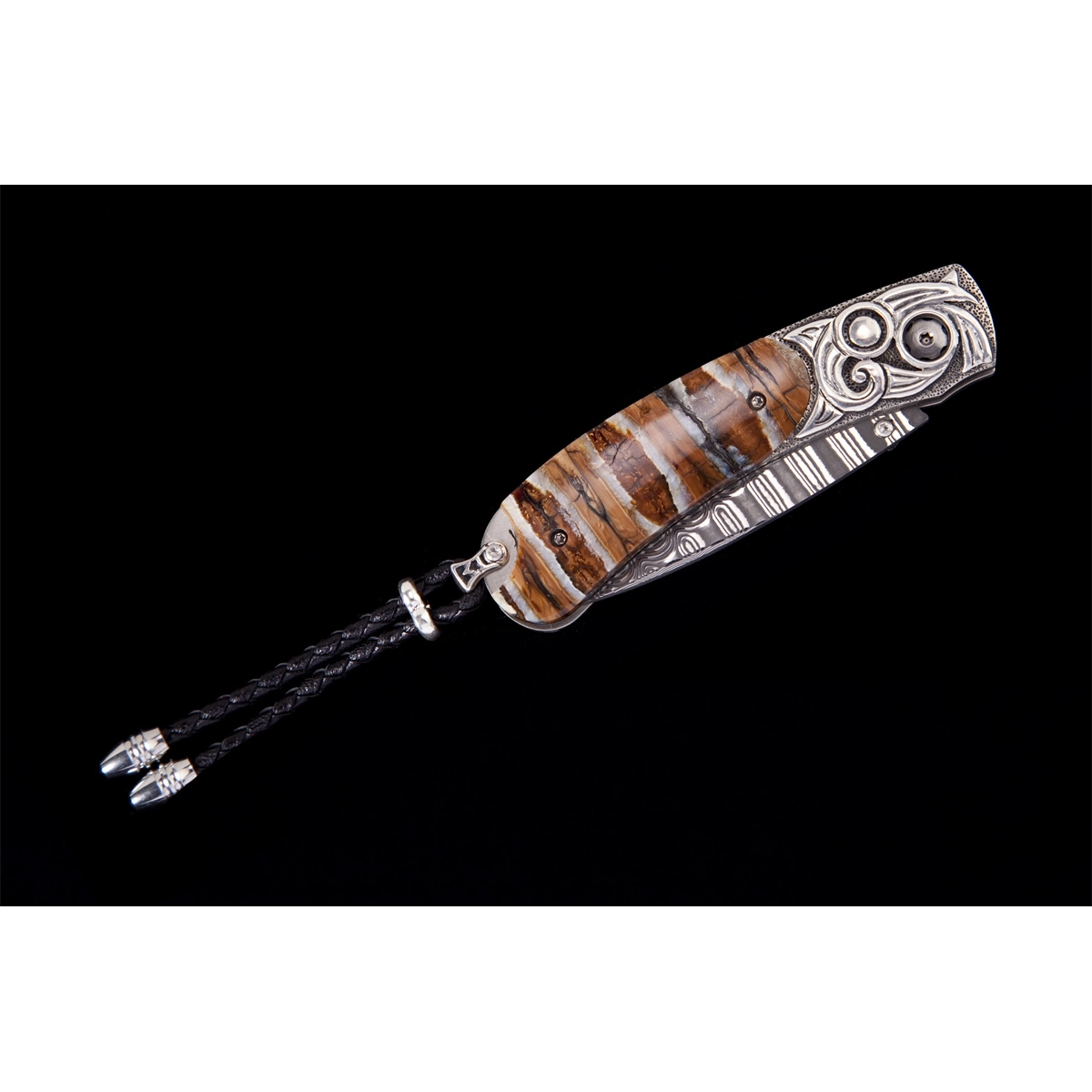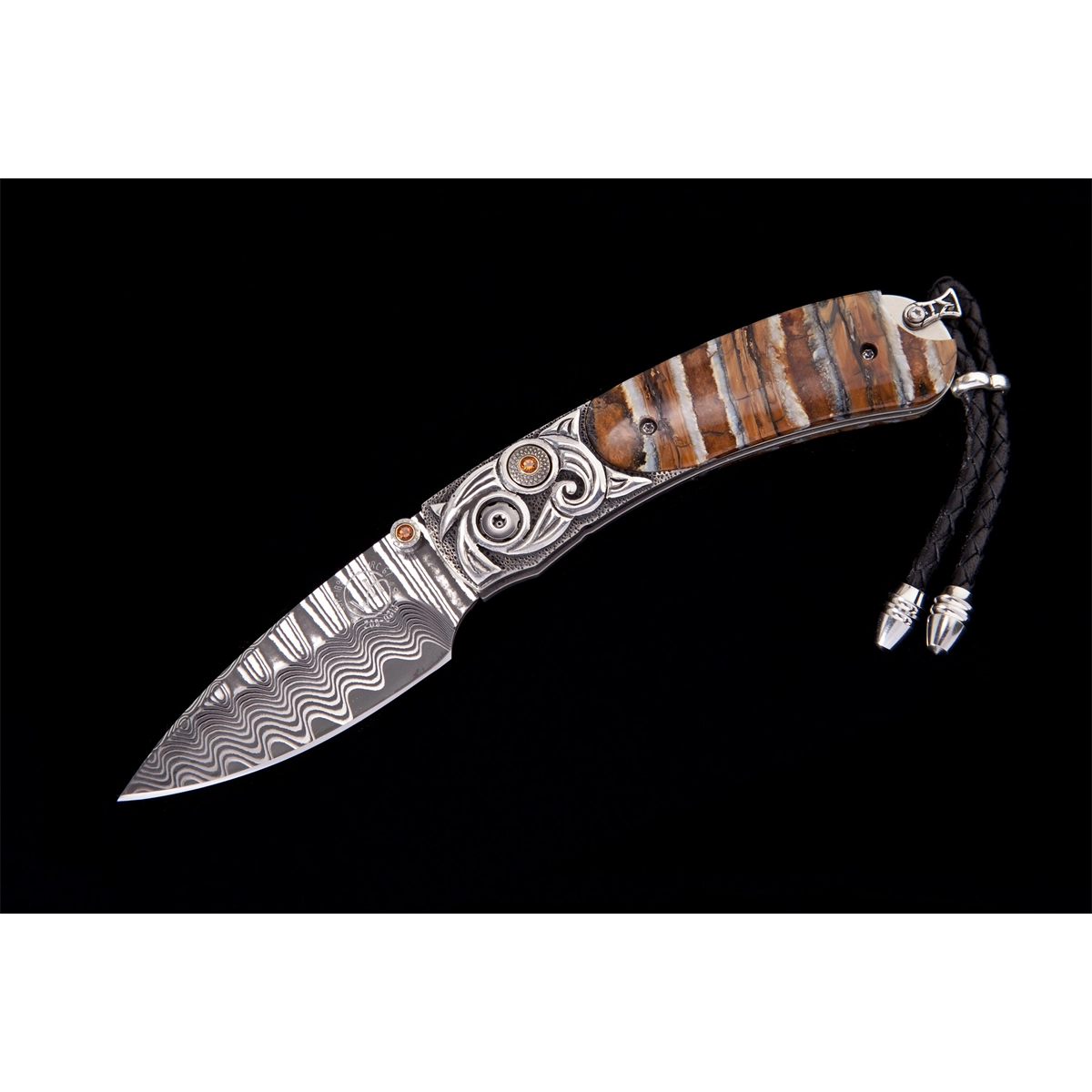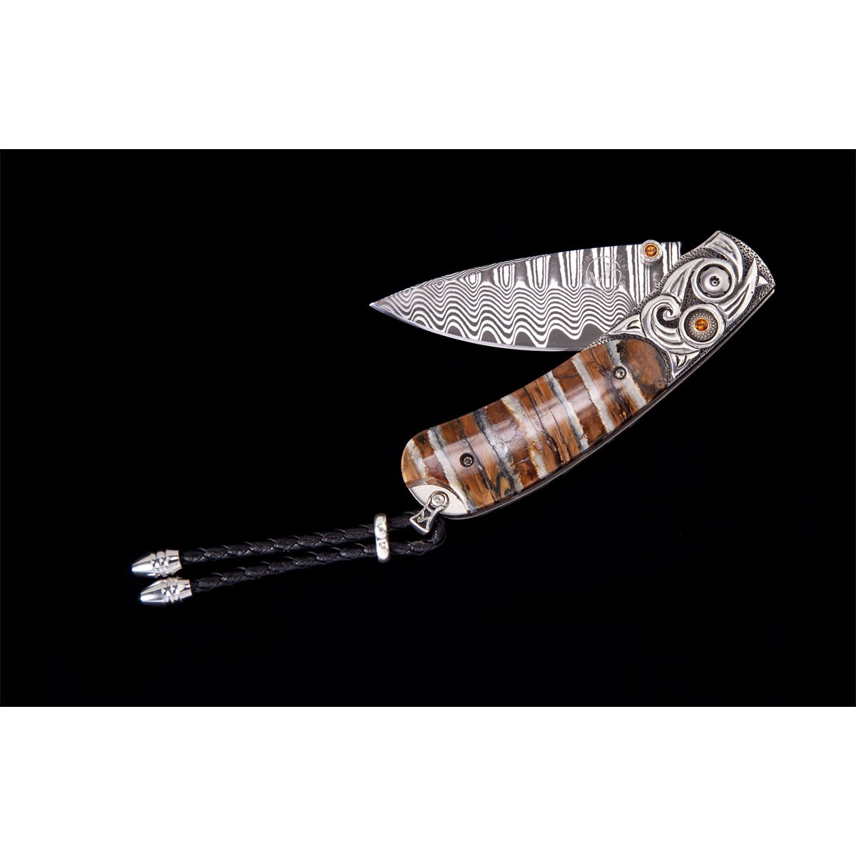 William Henry Knife. Kestrel "Deluge" model. Sterling silver handle inlaid with 10,000 year-old fossil Wooly Mammoth tooth. Hand forged damascus steel blade. One hand button lock and thumb stud set with citrine. *Patterns may not match photo