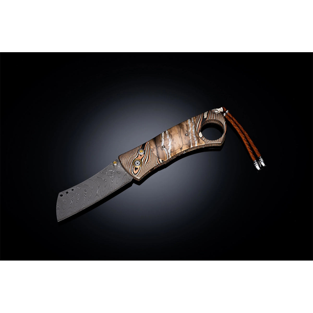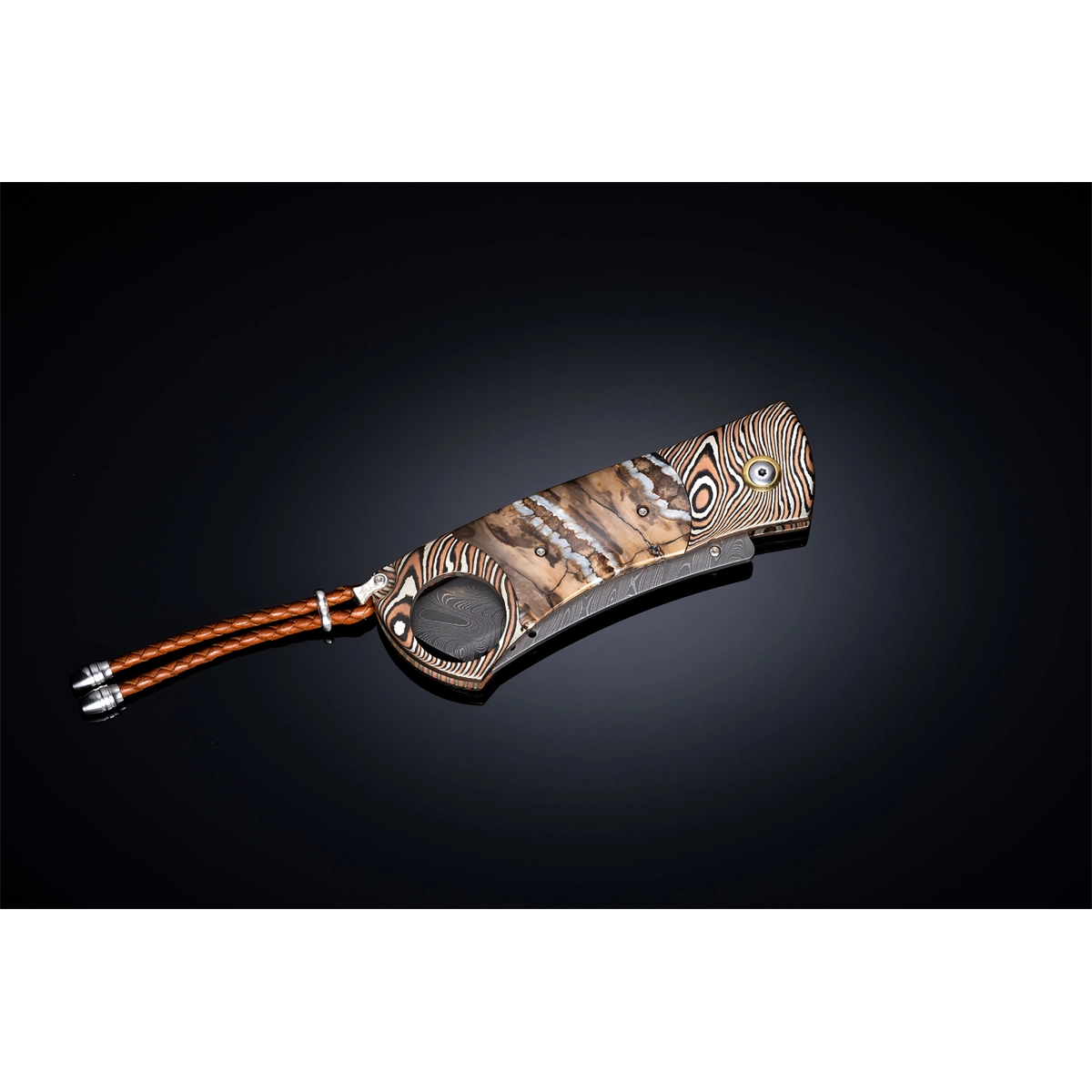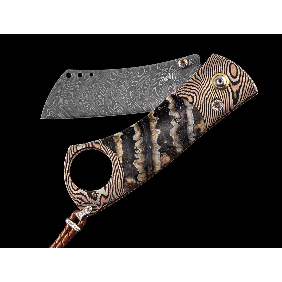 William Henry cigar cutter with forged Mokume frame. Damascus steel blade with inlayed fossil wooly mammoth tooth, citrine gemstones, titanium, stainless, and sterling hardware.
