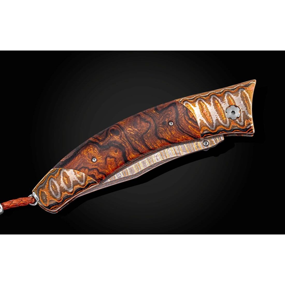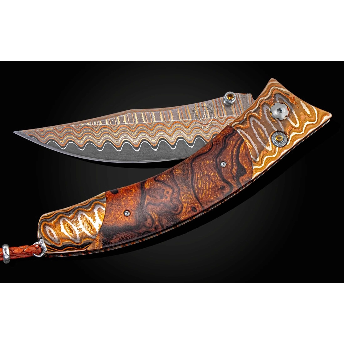William Henry Knife. Contour "Saw Tooth" model. Damascus handle inlaid with desert ironwood. Hand forged "Copper Wave" damascus steel blade. One hand button lock and thumb stud set with citrine gemstones. *Patterns may not match photo
