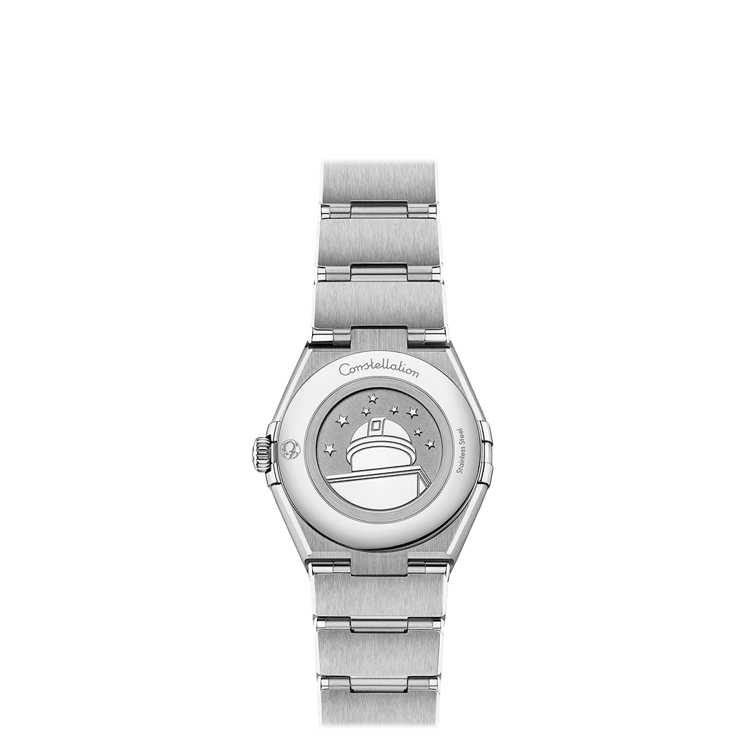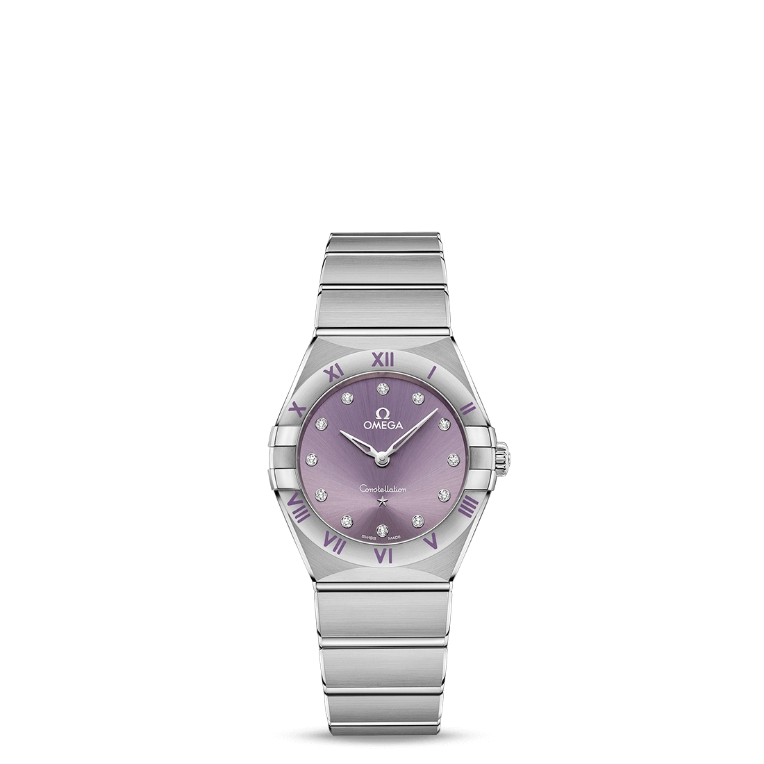 Omega watch. Constellation in stainless steel case and bracelet. Synthetic sapphire crystal. 28mm case. Swiss quartz movement. Patchouli Blossom diamond dial.