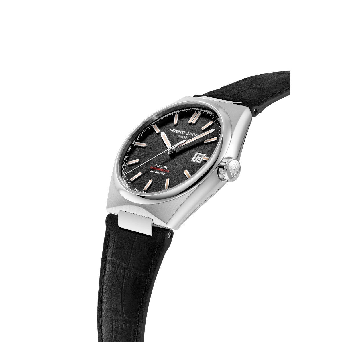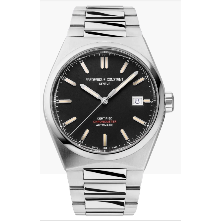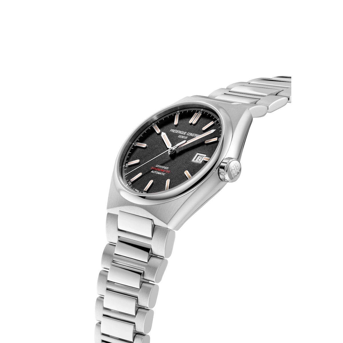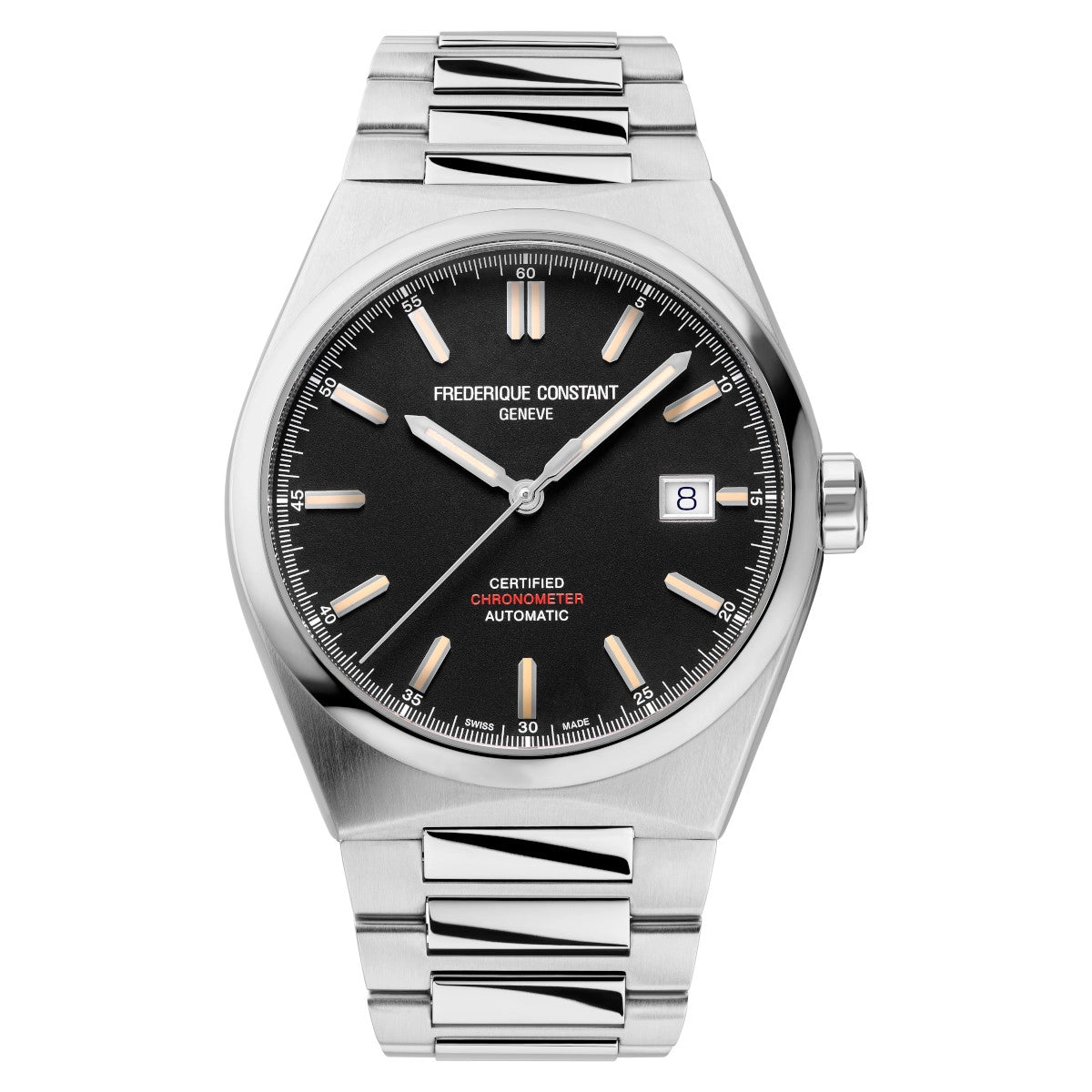 Frederique Constant watch. Highlife collection. 39mm case diameter. Stainless steel case and bracelet. Black dial. Automatic movement. COSC certified. Date. Comes with extra black strap.