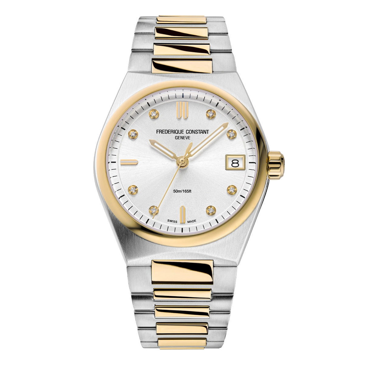 Frederique Constant watch. Highlife. Two-tone stainless steel and yellow gold-plated case and bracelet. Synthetic sapphire crystal. 31mm case. Silver dial with 8 diamonds. Total ctw 0.04. Swiss quartz movement. Date. Includes white rubber strap with gold-tone tang buckle.