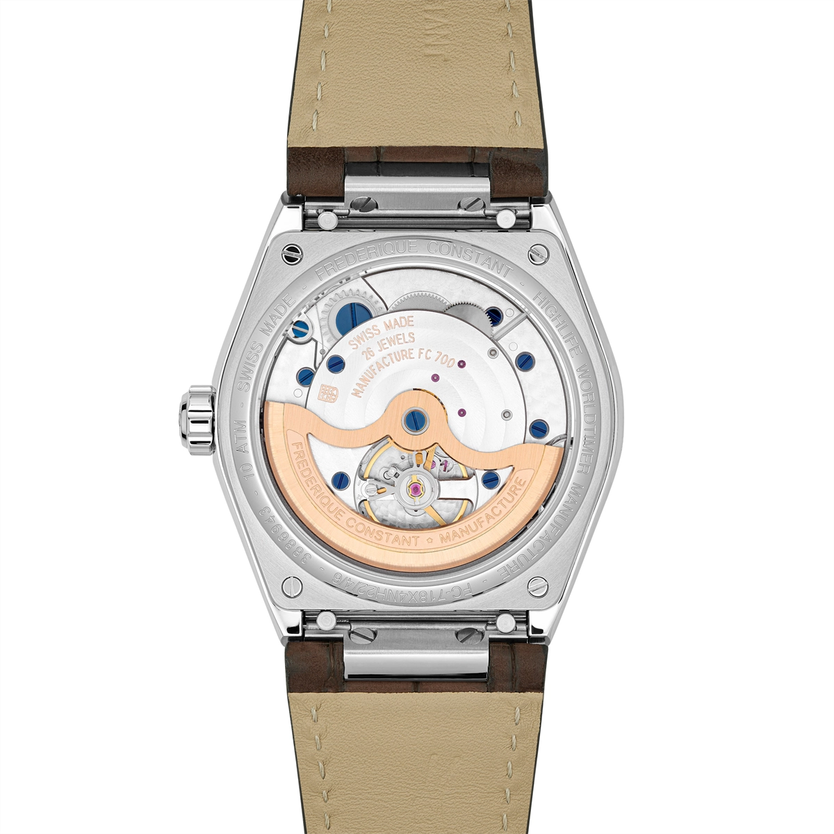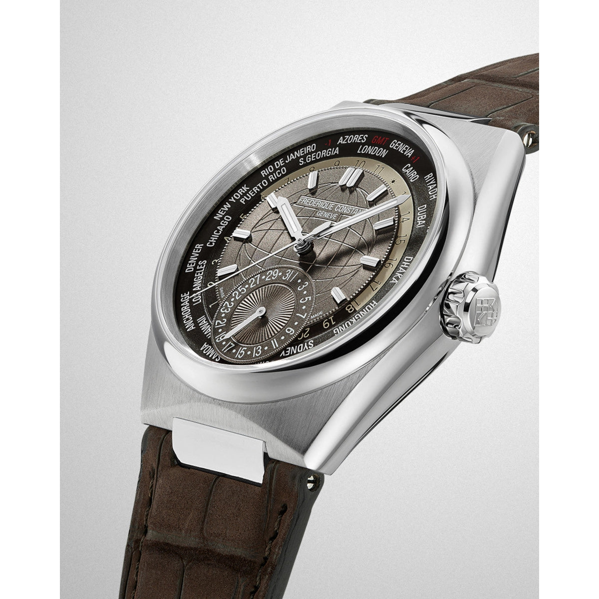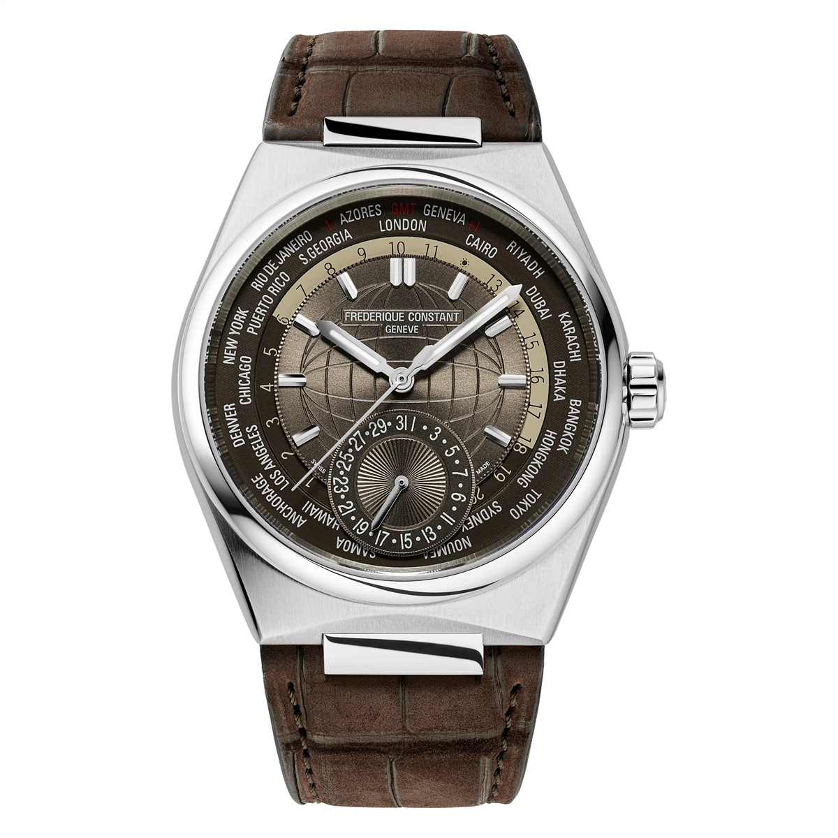 Frederique Constant watch. Highlife Worldtimer. 24 time zones. Automatic movement. 41mm case diameter in stainless steel. Synthetic sapphire crystal. Automatic movement. Brown leather strap.