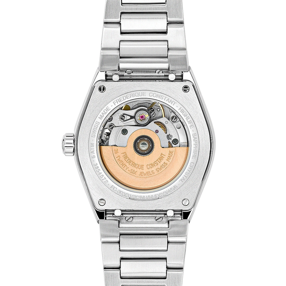 Frederique Constant watch. Ladies Highlife. 34mm case diameter. Stainless steel case and bracelet. Comes with black rubber strap. Synthetic sapphire crystal. Purple dial with eight diamond dial markers with a total weight of .32 carat. Automatic movement. Date.