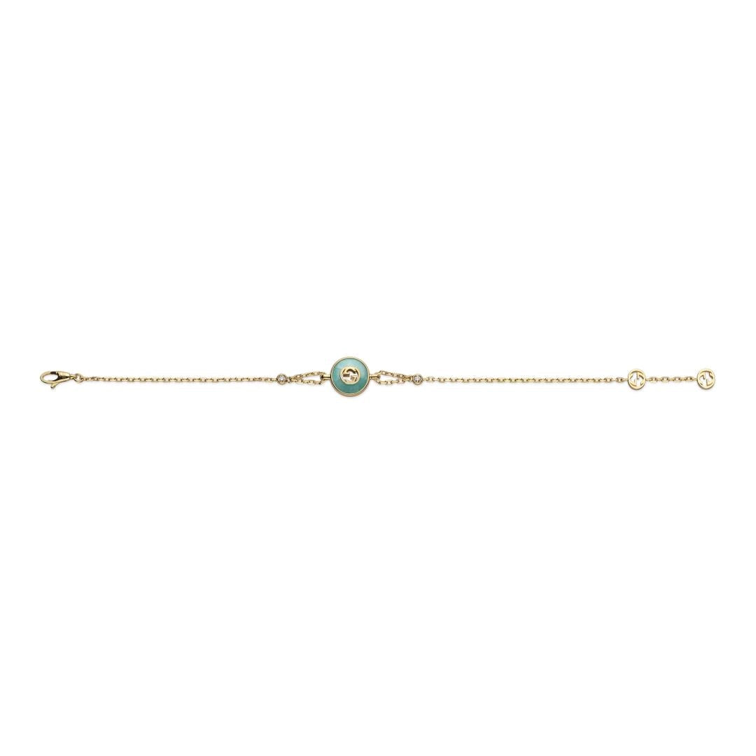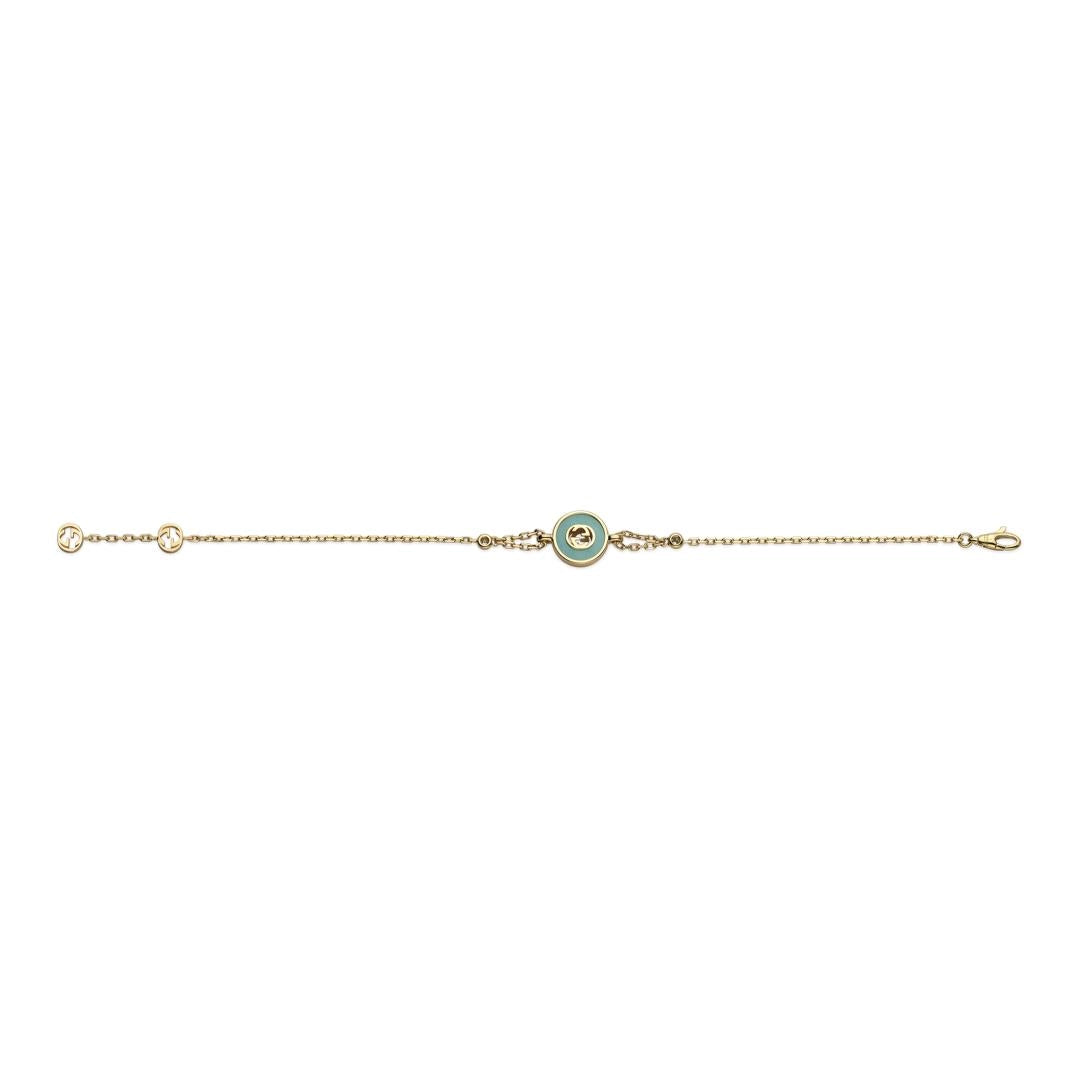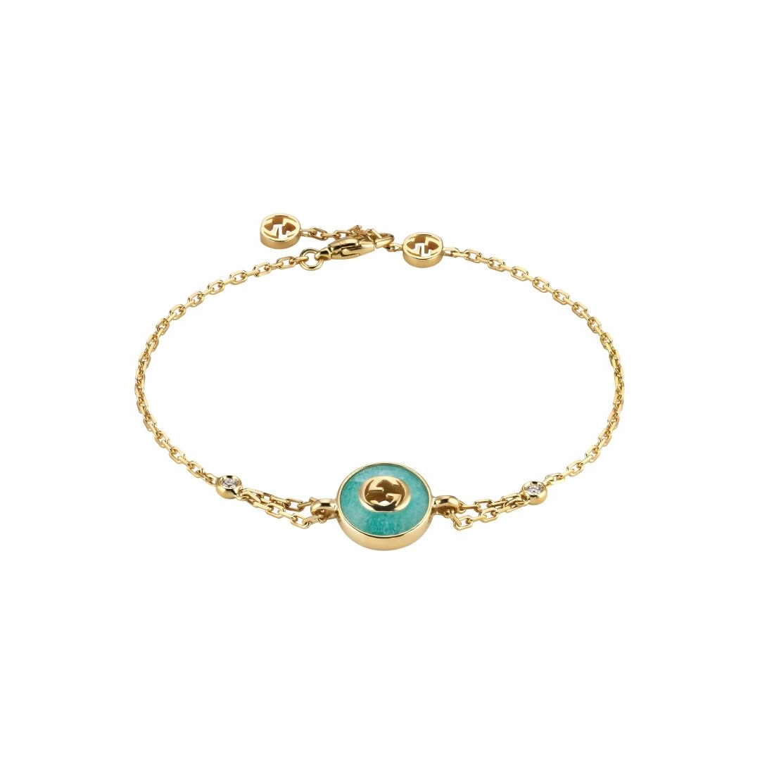 Ladies Gucci bracelet. 18 karat yellow gold. Interlocking G bracelet with two round brilliant cut diamonds with a total weight of 0.05 carat and amazonite.