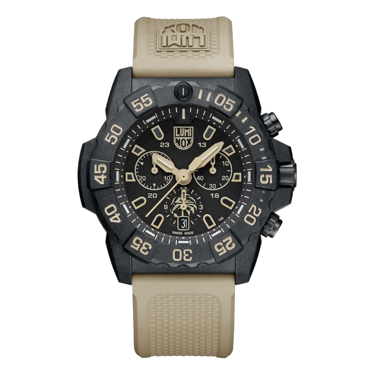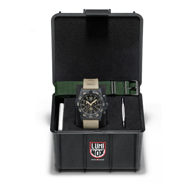 Luminox watch. Navy Seal Foundation Military. 45mm case diameter in stainless steel and Carbonox. Hardened mineral crystal. Black dial. Sand rubber strap. Chronograph. Date. Comes with extra green webbing strap and changing tool.