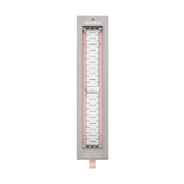 Michele 38/40mm and 42/mm White and Stainless Silicone-Wrapped Bracelet For Apple Watch (Bracelet Only). Made for use with Series 1,2,3,4,5, or 6 Apple Watch. Includes two interchangeable endpieces compatible with both 38/40mm and 42/44mm styles. Apple Watch® is a trademark of Apple, Inc.