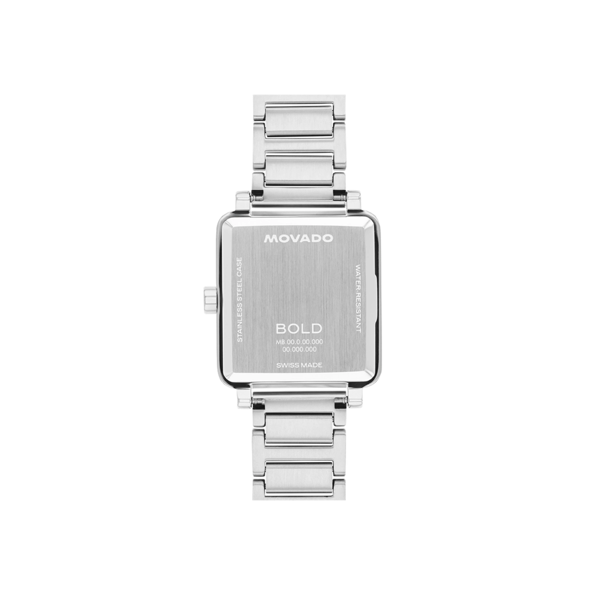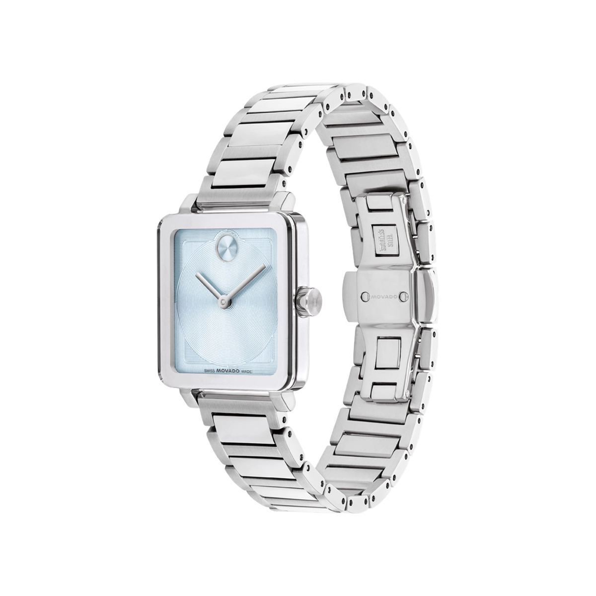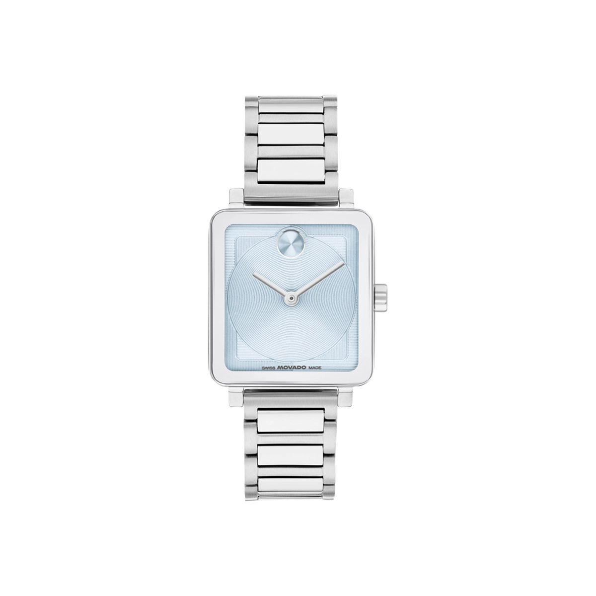 Movado watch. Bold Evolution 2.0. 28x26mm case. Stainless steel case and bracelet. Mineral glass crystal. Light blue dial. Swiss quartz movement.