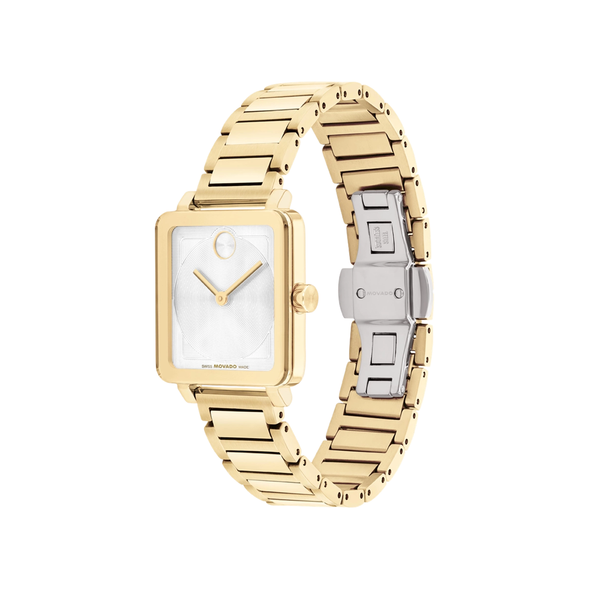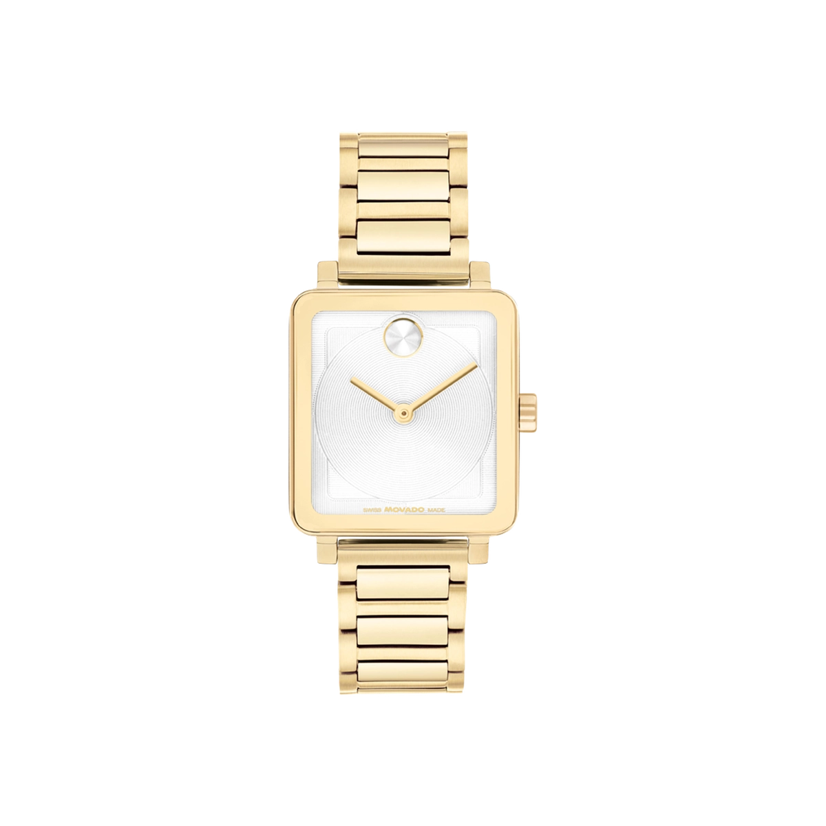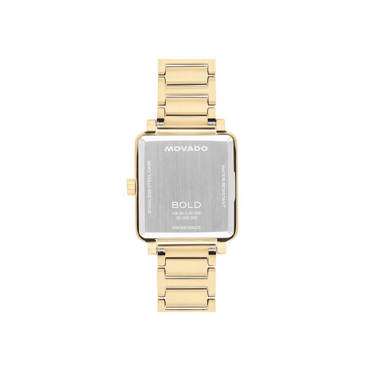 Movado watch. Bold Evolution 2.0. 28x26mm case. Pale gold ionic plated stainless steel case and bracelet. White dial. Mineral glass crystal. Swiss quartz movement.