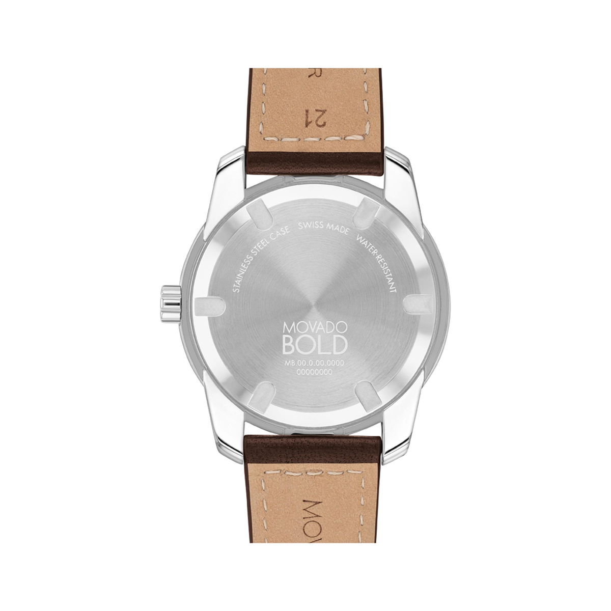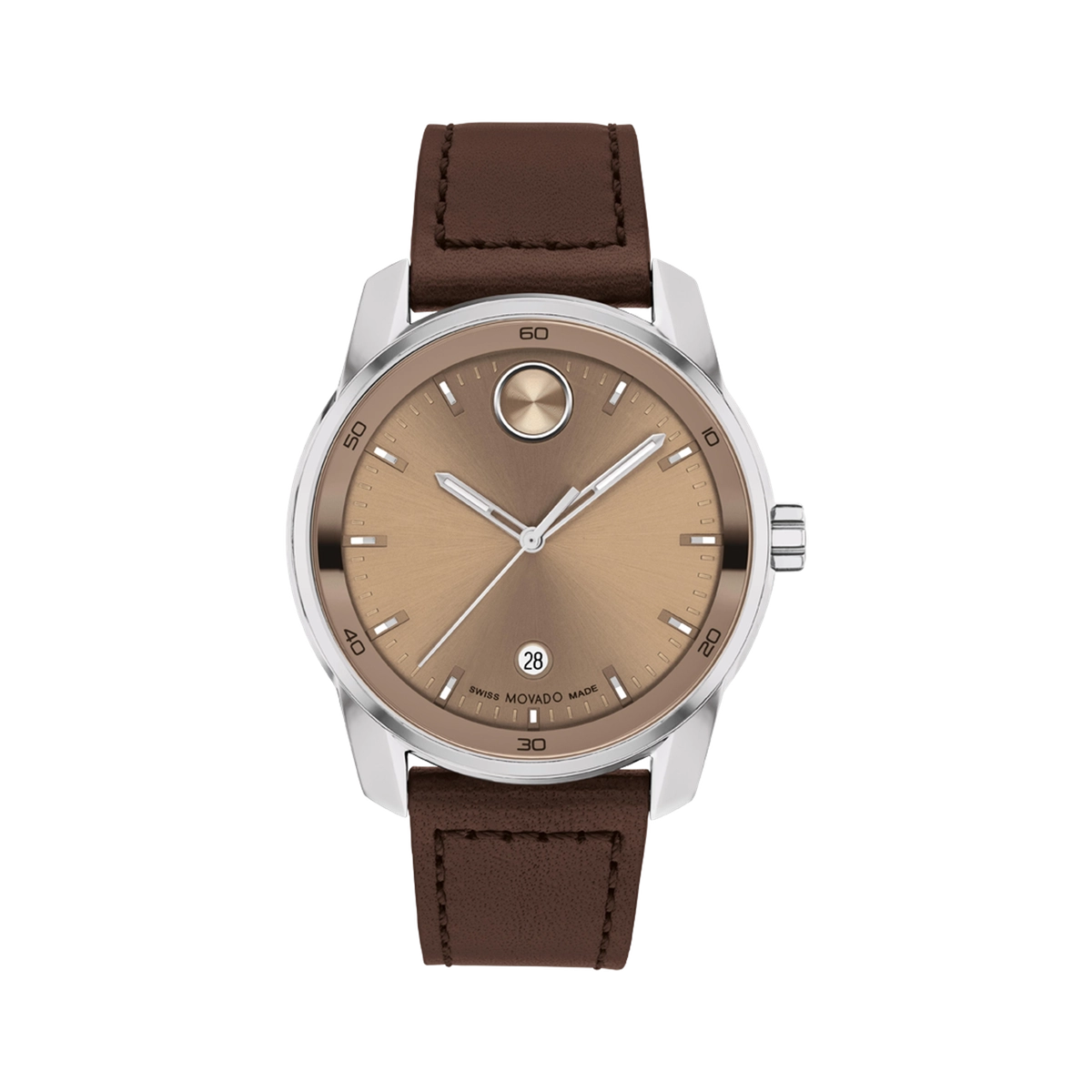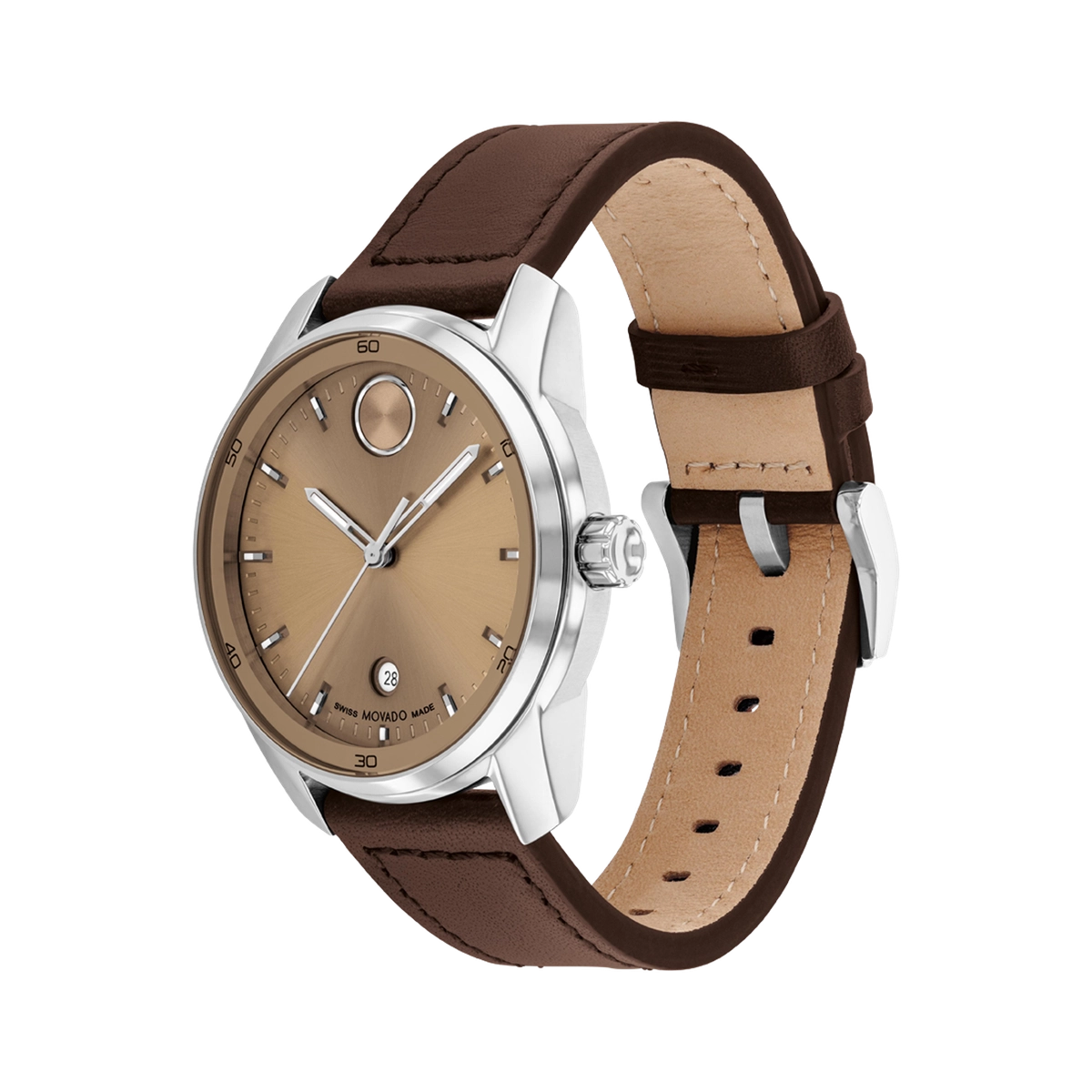 Movado watch. Bold Verso. 42mm case diameter in stainless steel. Mineral glass crystal. Clay colored dial. Swiss quartz movement. Brown leather strap. Date.