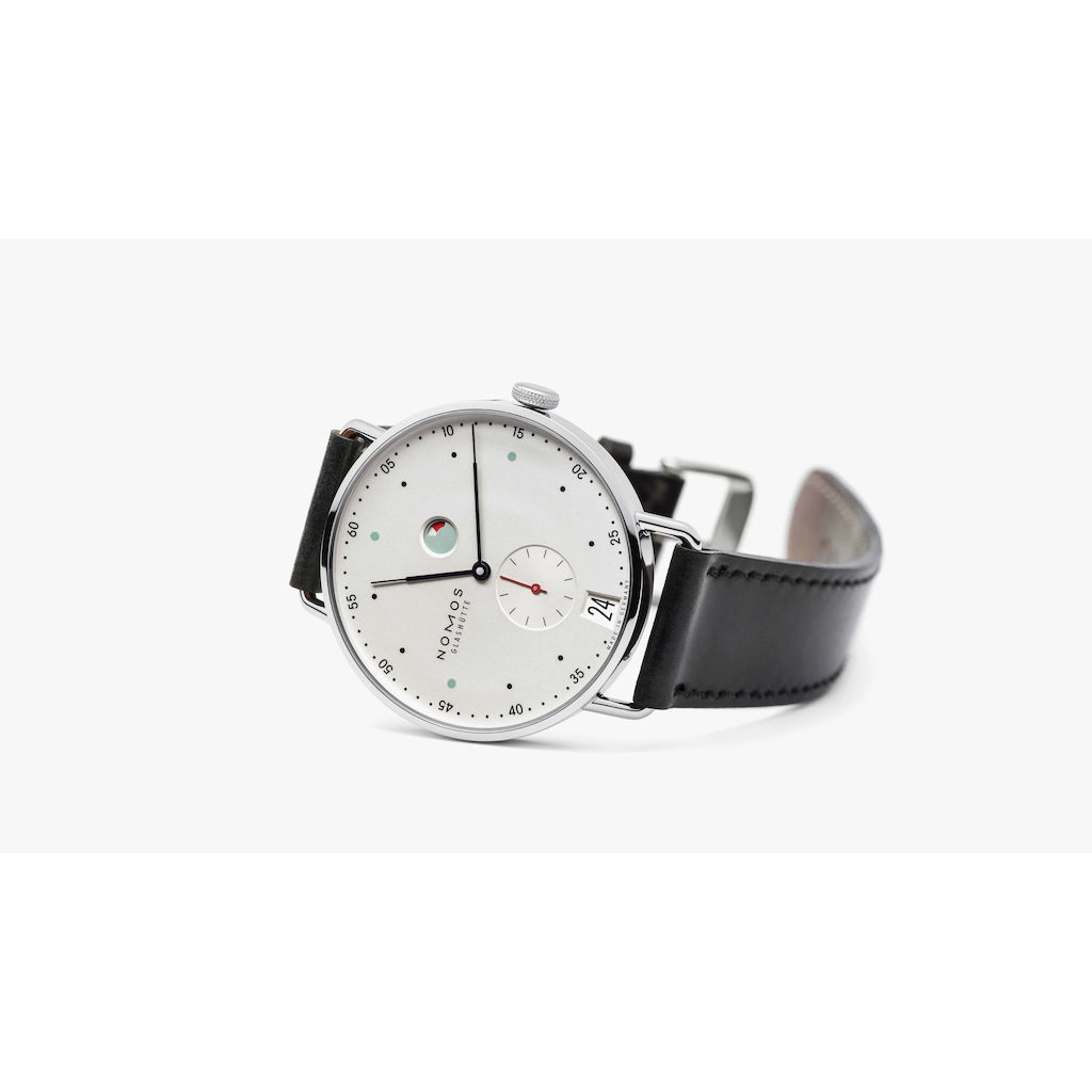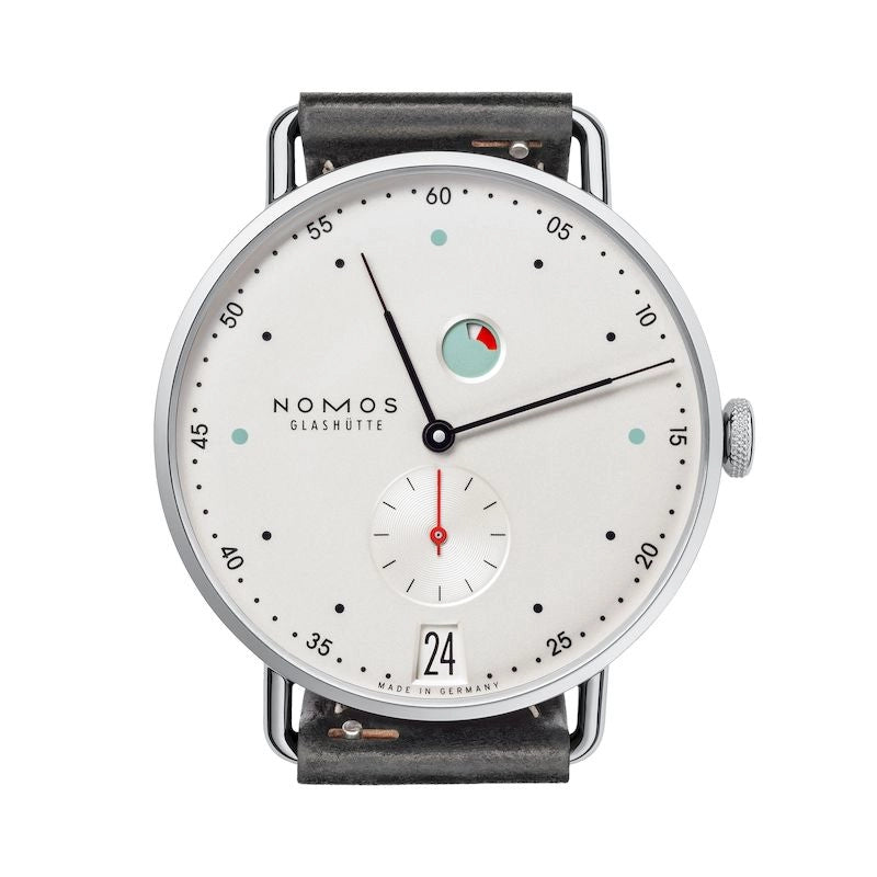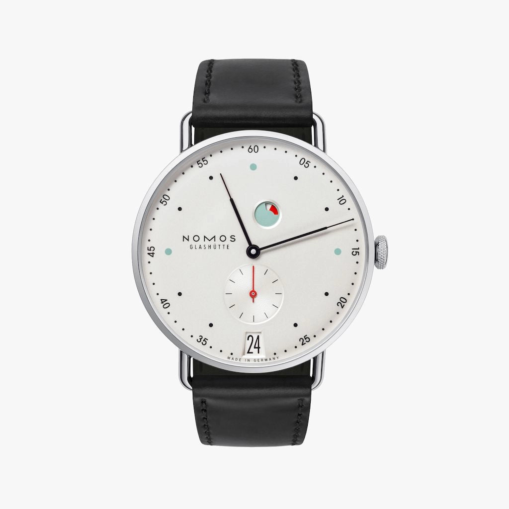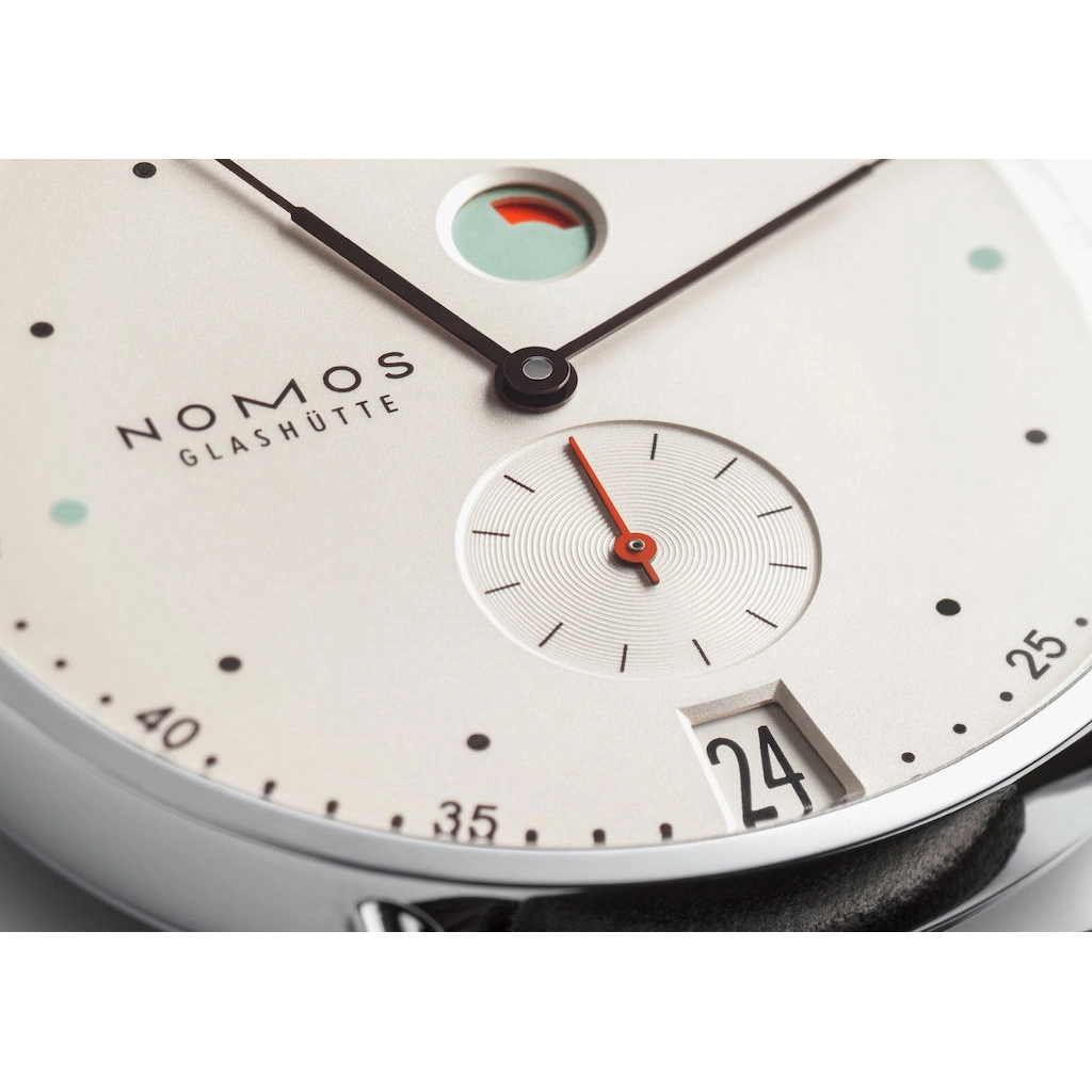 NOMOS Glashütte watch. Metro in stainless steel case. Synthetic sapphire crystal. White silver-plated dial. Black leather strap with tang buckle. Exhibition caseback. Manual wind movement. NOMOS caliber DUW 4401. Date. Power reserve indicator.