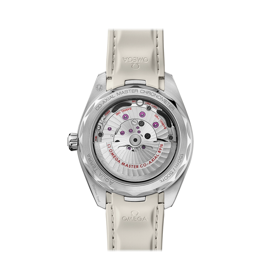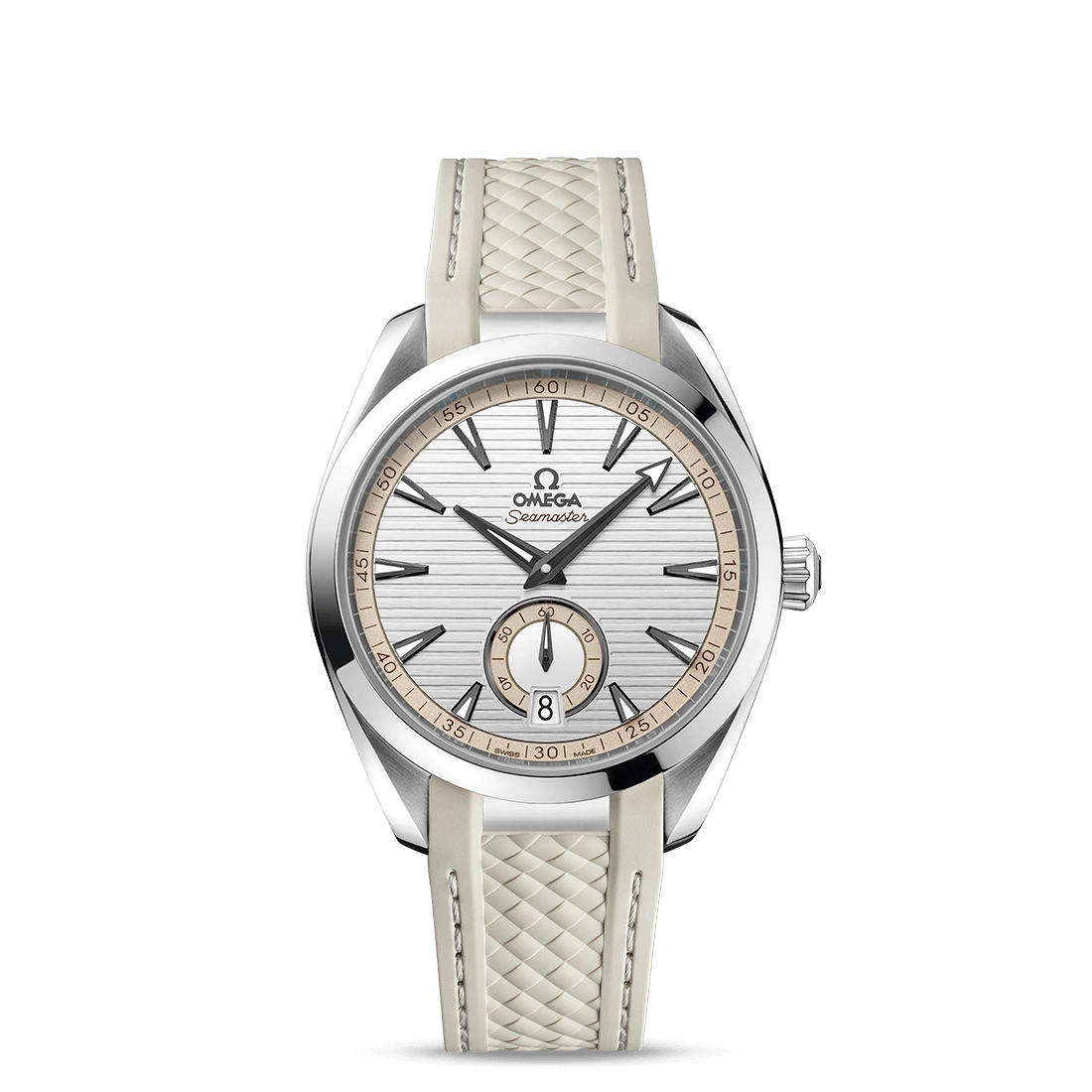 Omega watch. Seamaster Aqua Terra 150m Co-Axial Master Chronometer Small Seconds. Synthetic sapphire crystal. 41mm case. Silver dial. White rubber strap. Swiss automatic co-axial movement. Date. Master chronometer.