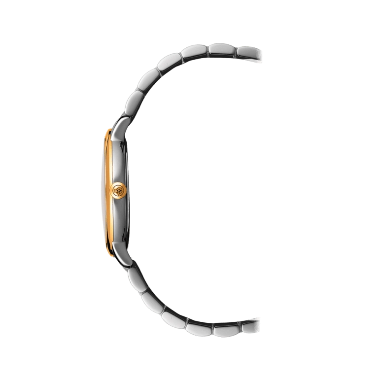 Raymond Weil watch. Toccata in two-tone, gold-tone and stainless steel case and bracelet. Synthetic sapphire crystal. 39mm case. Silver dial. Smooth bezel. Swiss quartz movement. Date.