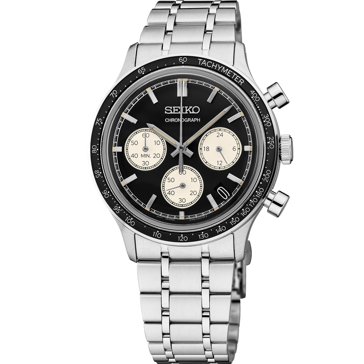 Seiko watch. Essentials collection. 38.7mm case diameter. Stainless steel case and bracelet. Hardle crystal. Black dial. Chronograph. Quartz movement. Date.