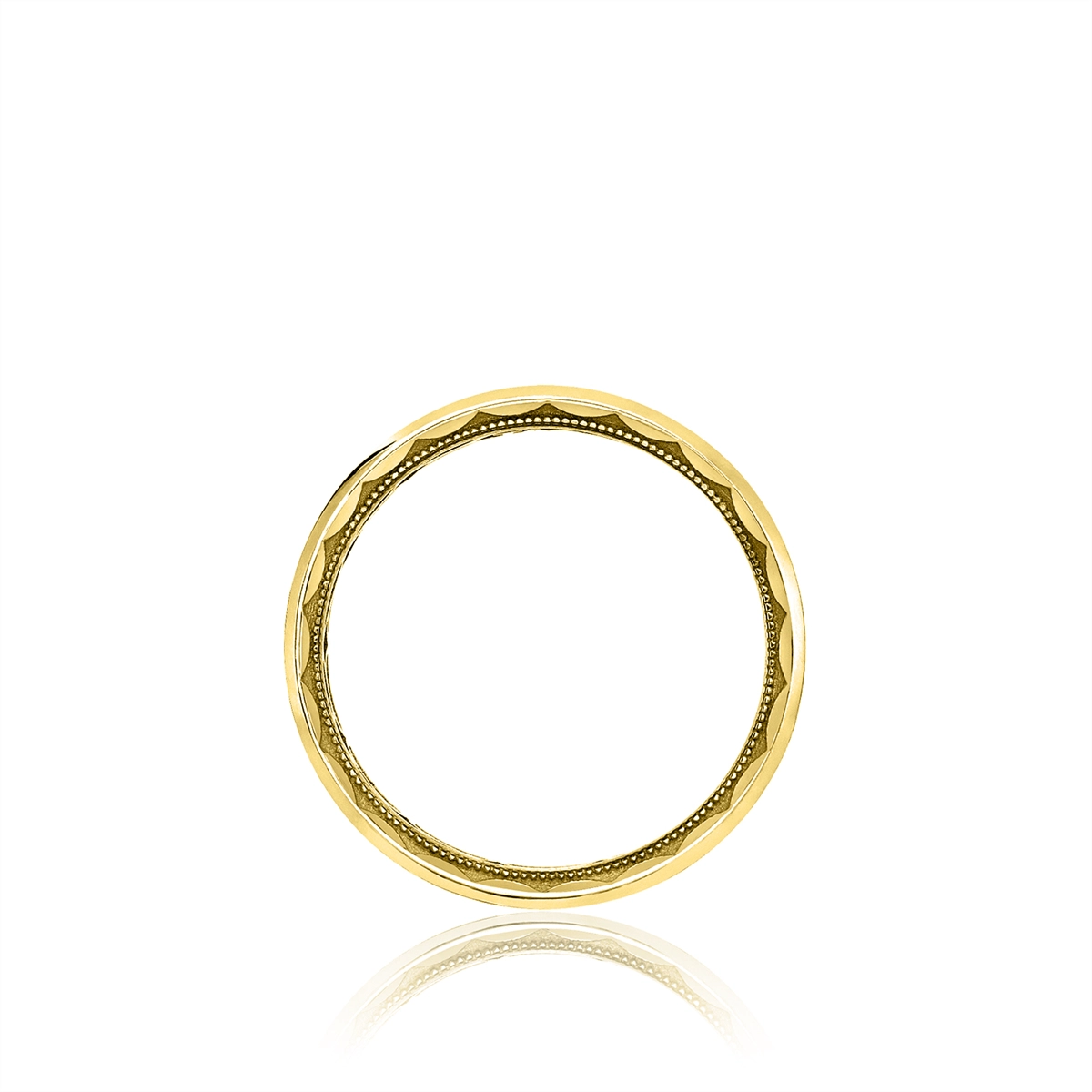 Gents Tacori wedding band in 18 karat yellow gold. The band measures 6 mm wide with beveled edges and a brushed finish center with Tacori's signature sculpted crescent design on the profile of the band. **Contact store to order your size
