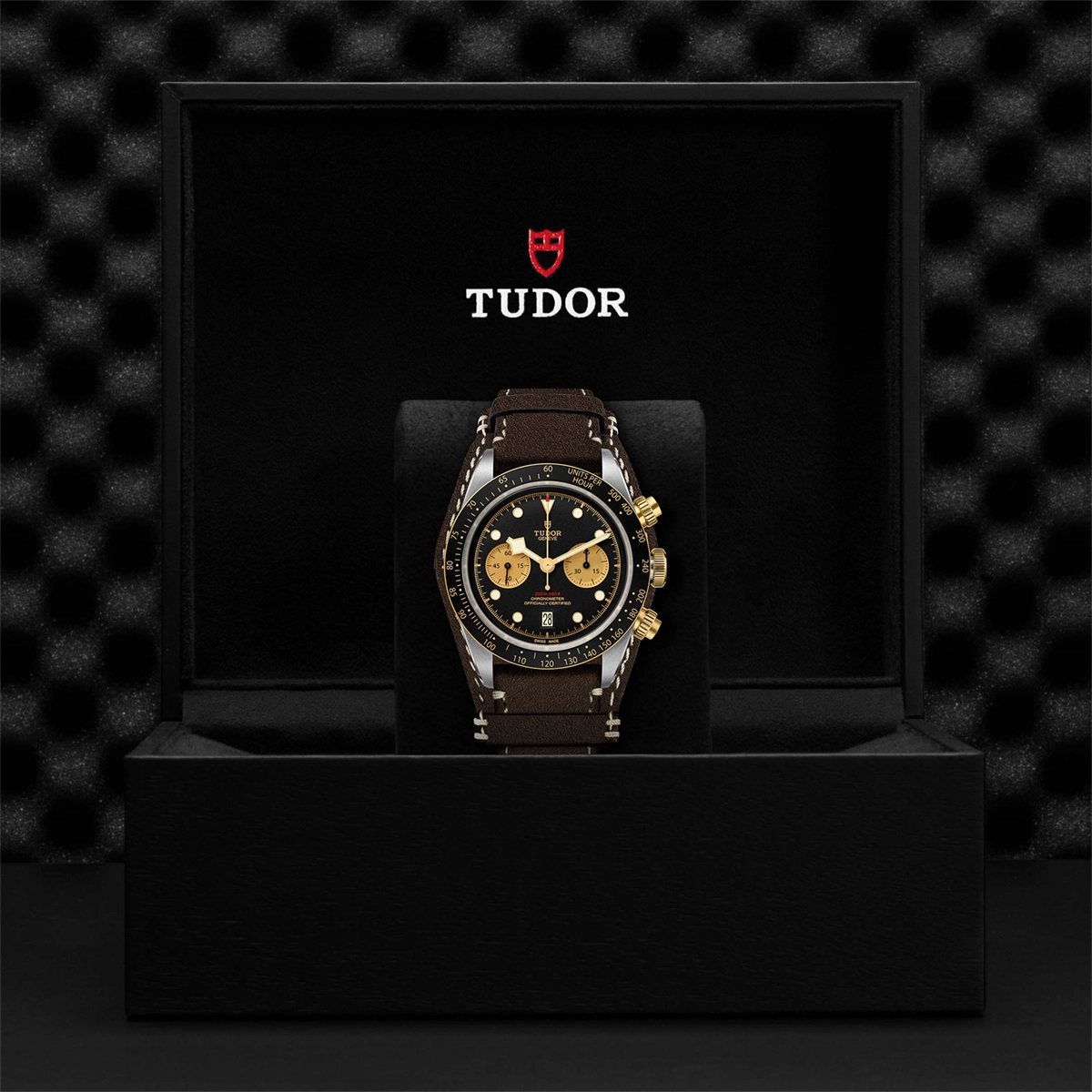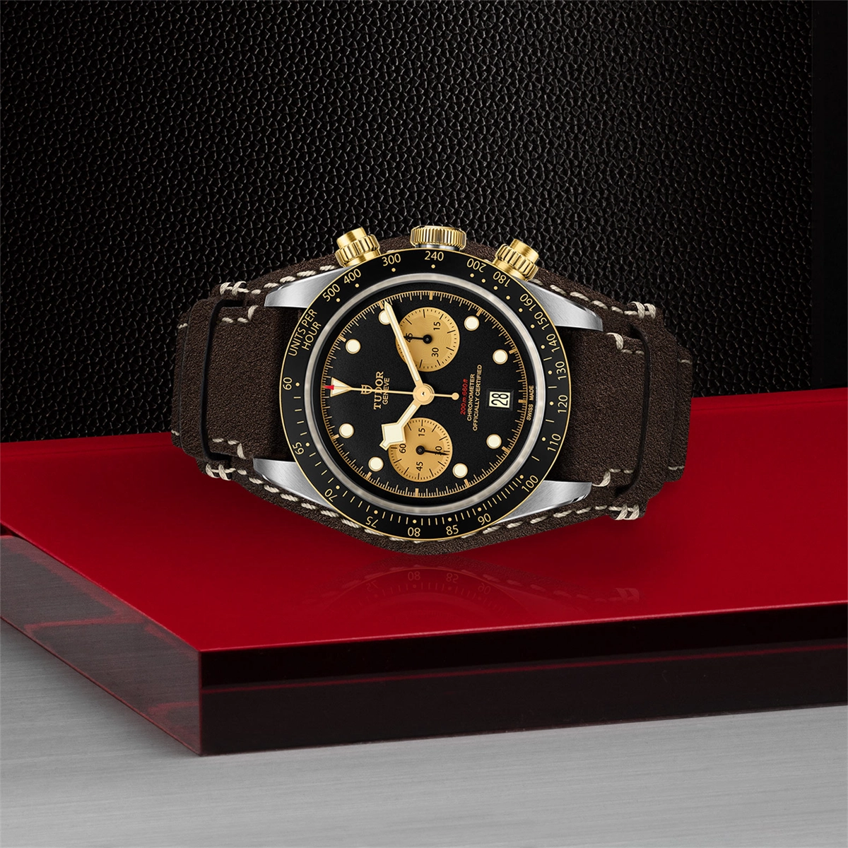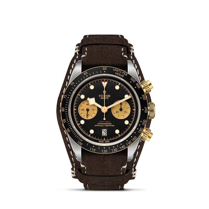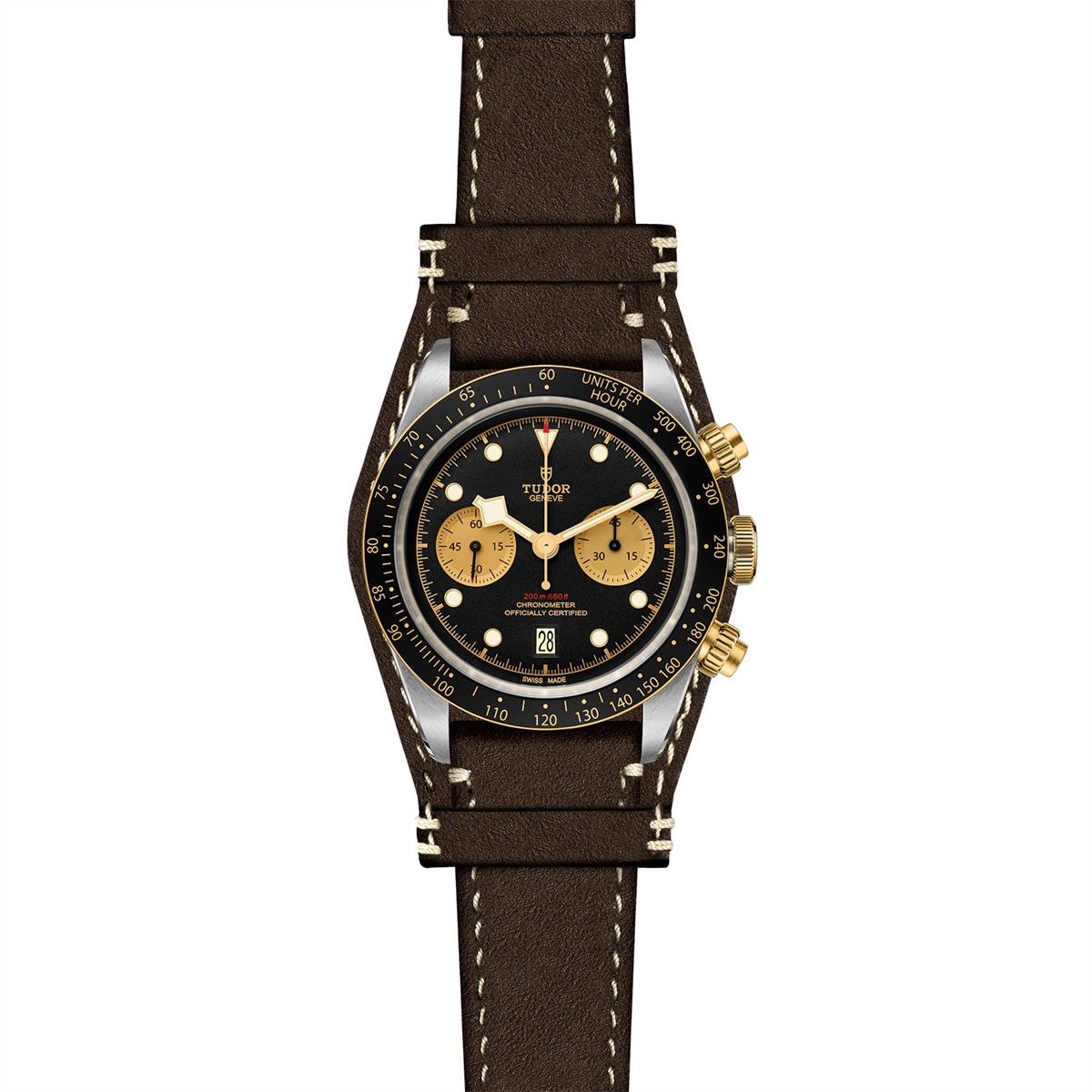 TUDOR watch. Black Bay Chrono S&G. Steel case with polished and satin finish. Yellow gold pushers. Domed sapphire crystal. 41mm case. Black dial, domed. Fixed yellow gold bezel with matt black anodised aluminium disc with tachymetric scale, yellow gold markings. Brown leather strap with removable bund, with folding clasp and safety catch. Manufacture Calibre MT5813 (COSC) Self-winding mechanical movement with bidirectional rotor system. Approximately 70 hour power reserve. Date.