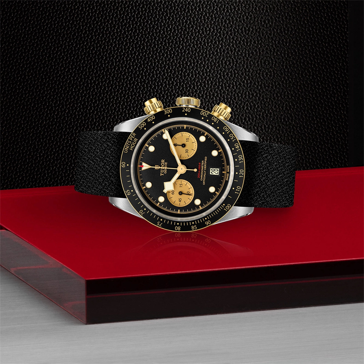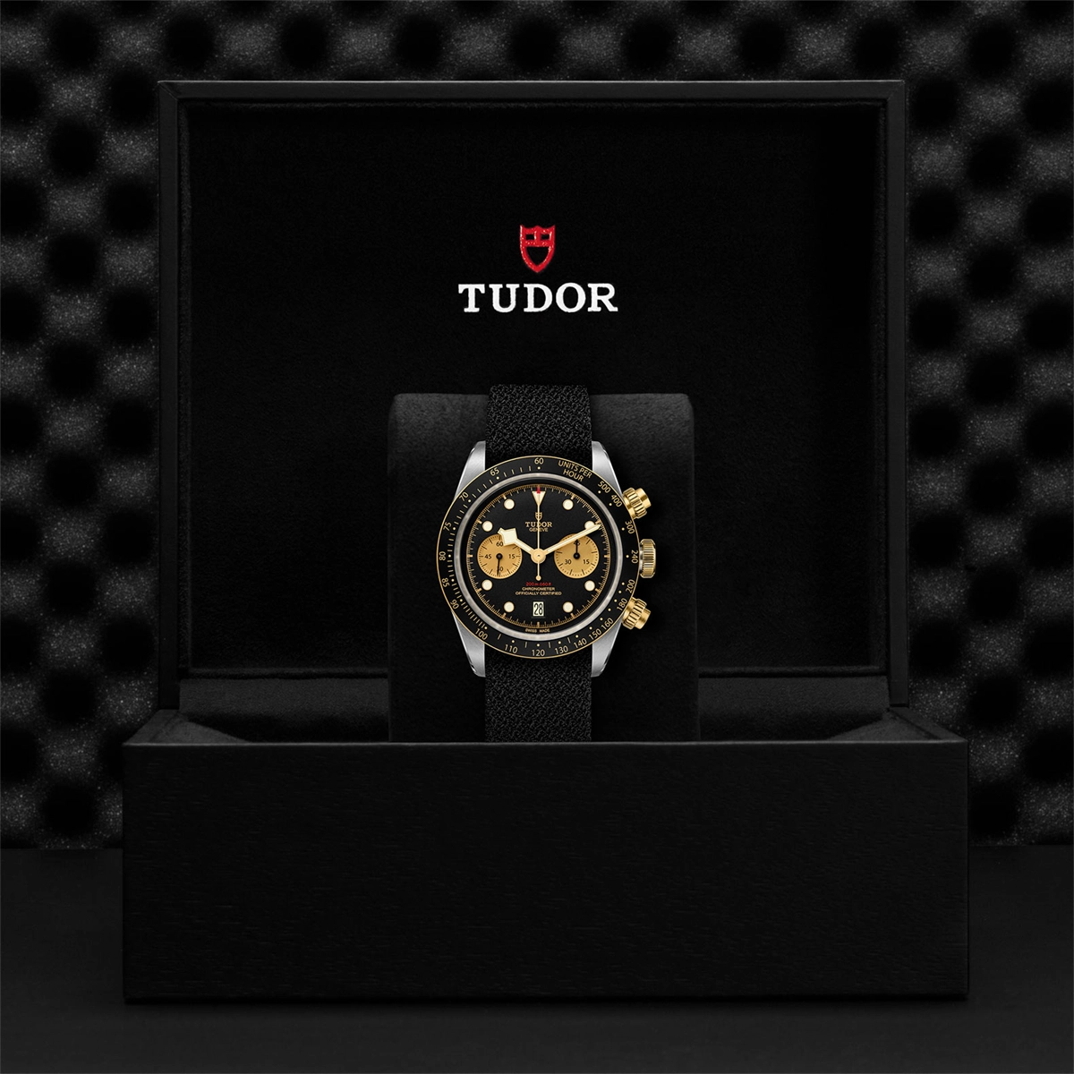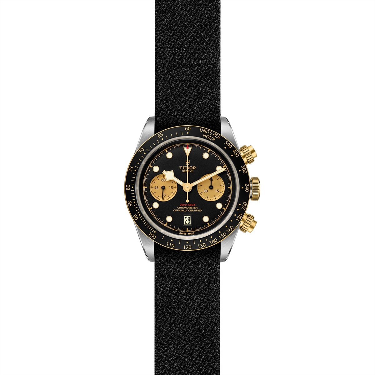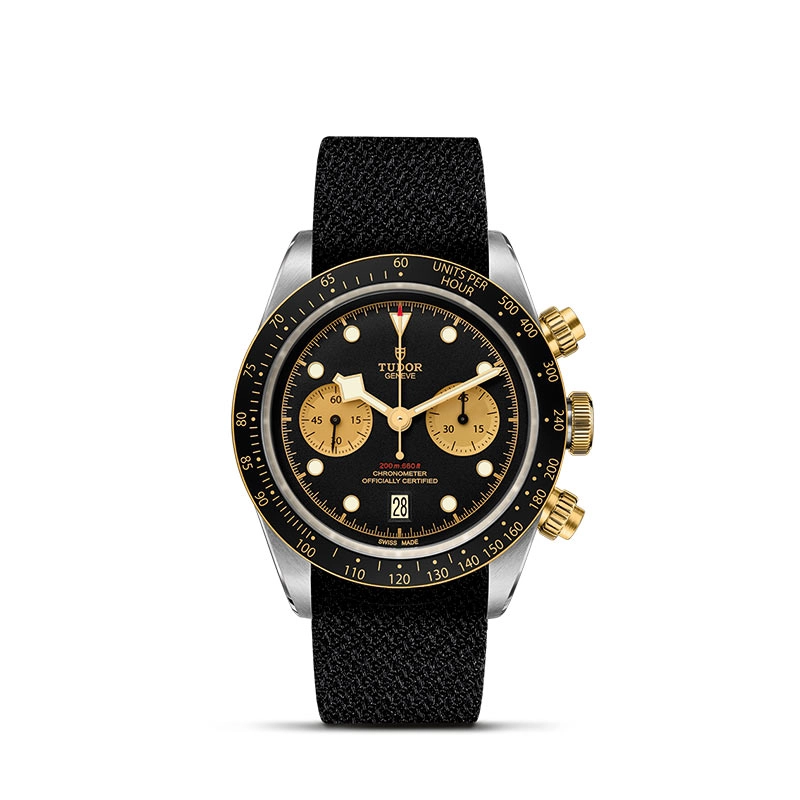 TUDOR watch. Black Bay Chrono S&G. Domed sapphire crystal. 41mm case. Steel case with polished and satin finish. Black dial, domed. Black fabric strap with buckle. Fixed yellow gold bezel with matt black anodised aluminium disc with tachymetric scale, yellow gold markings. Manufacture Calibre MT5813 (COSC) Self-winding mechanical movement with bidirectional rotor system. Approximately 70 hours power reserve. Yellow gold screw-down winding crown. Date. Waterproof to 200M.