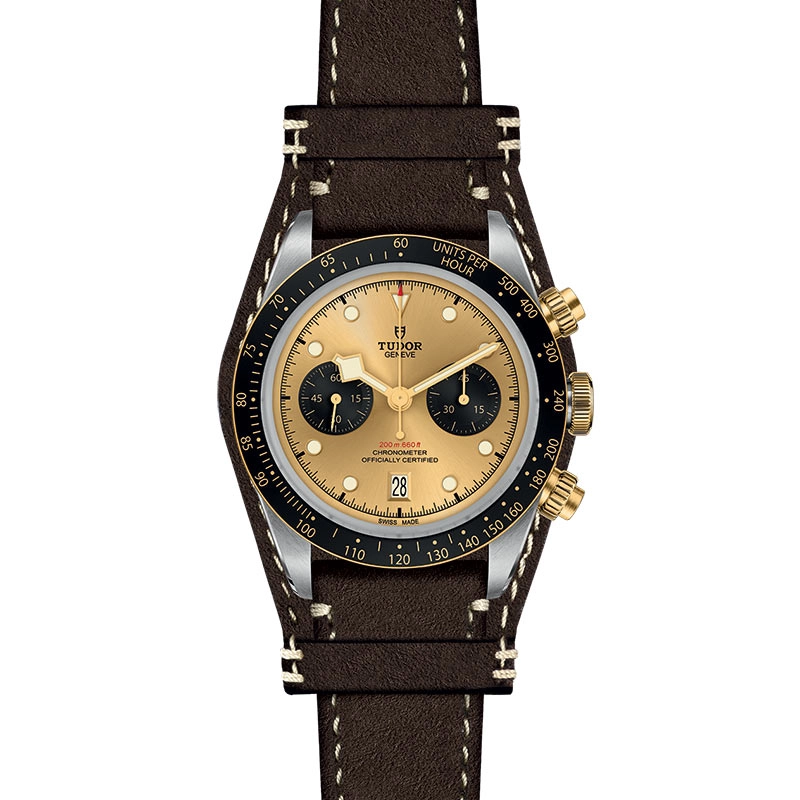 TUDOR watch. Black Bay Chrono S&G. Steel case with polished and satin finish. Brown leather with removable bund, with folding clasp and safety catch. Domed sapphire crystal. 41mm case. Champagne-color dial with black counters, domed. Fixed yellow gold bezel with matt black anodized aluminium disc with tachymetric scale. Manufacture Calibre MT5813 (COSC) Self-winding mechanical movement with bidirectional rotor system. Date. Approximately 70 hour power reserve. Waterproof to 200M.