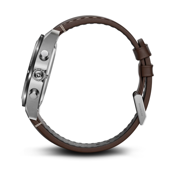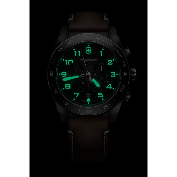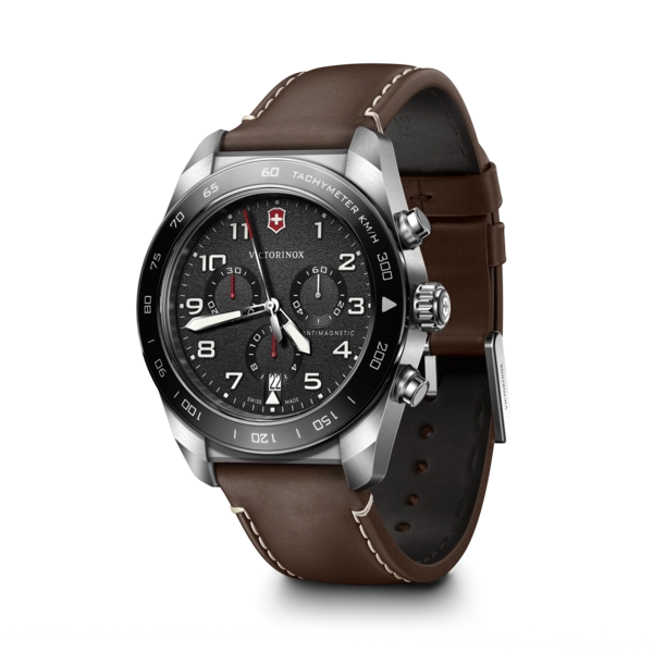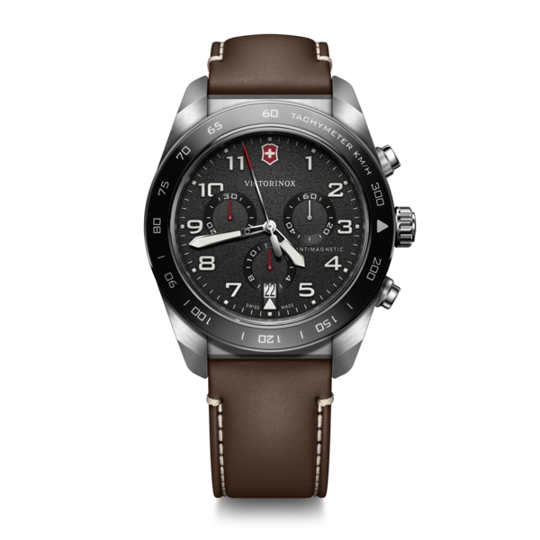 Victorinox watch. Swiss Army Chronograph. 42mm case diameter in stainless steel. Synthetic sapphire crystal. Black dial with three subdials. Date at 6 o'clock. Tachymeter bezel. Swiss quartz movement. Brown leather strap.