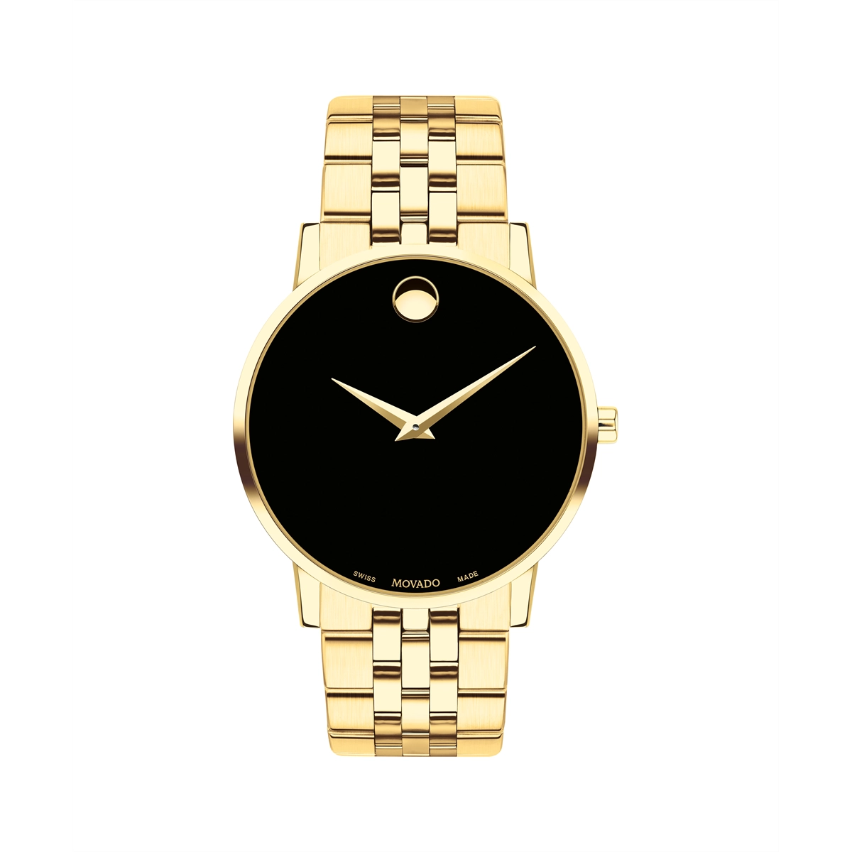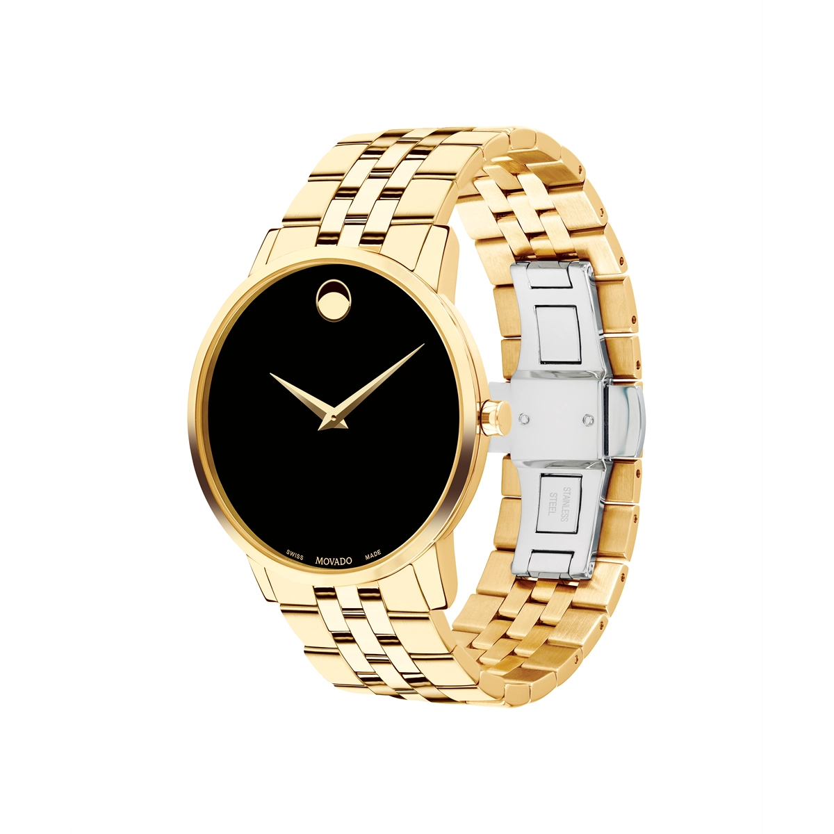 Movado watch. Museum Classic in yellow gold PVD-finished stainless steel case and bracelet. Synthetic sapphire crystal. 40mm case. Black Museum dial with concave dot. Swiss quartz movement.
