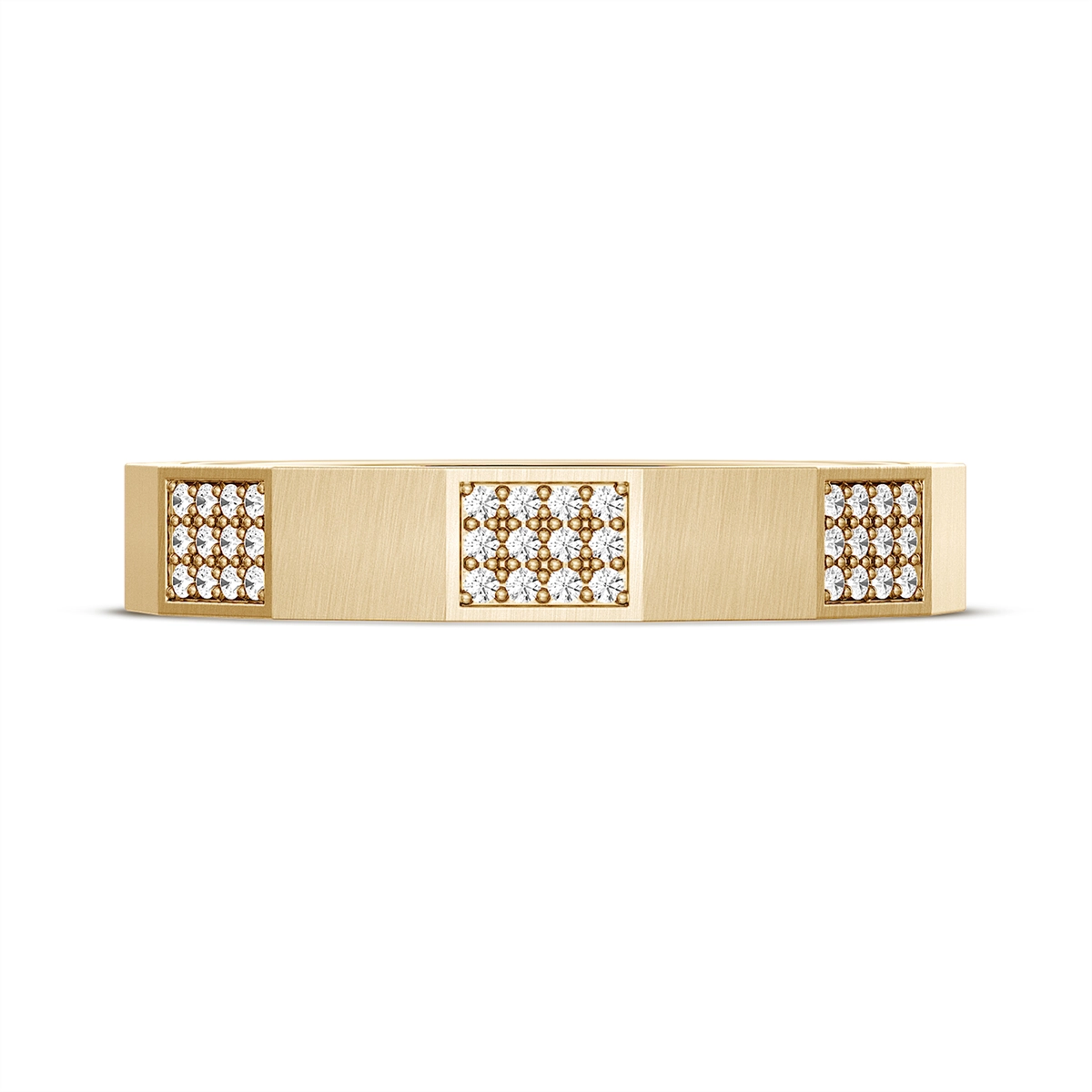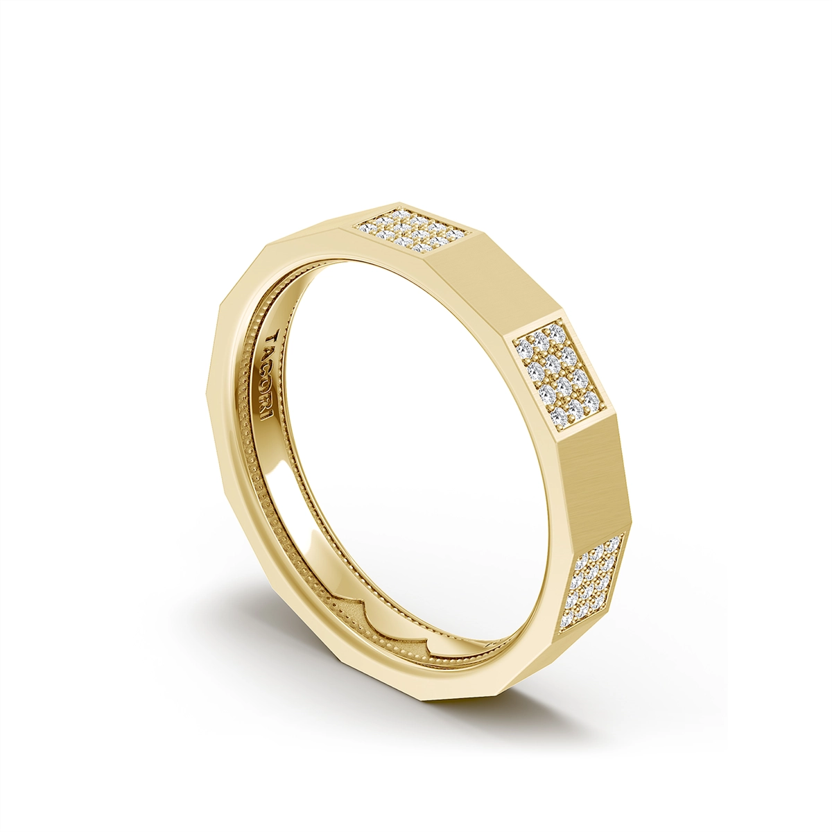 Ladies Tacori diamond band in 18 karat yellow gold. Set in the 4mm satin band are 72 round brilliant cut diamonds with a total weight of 0.42 carat. *Not sizable, contact store to order