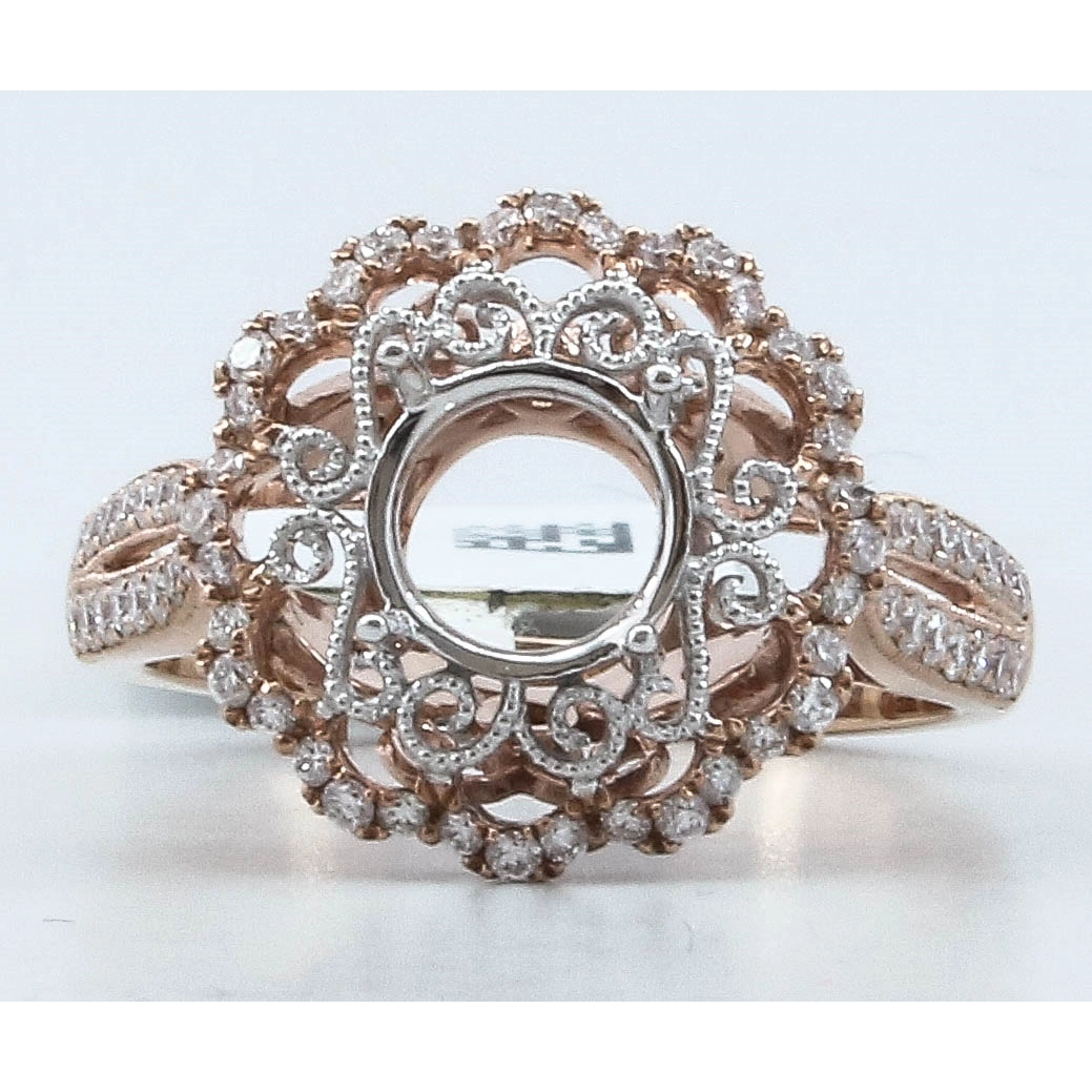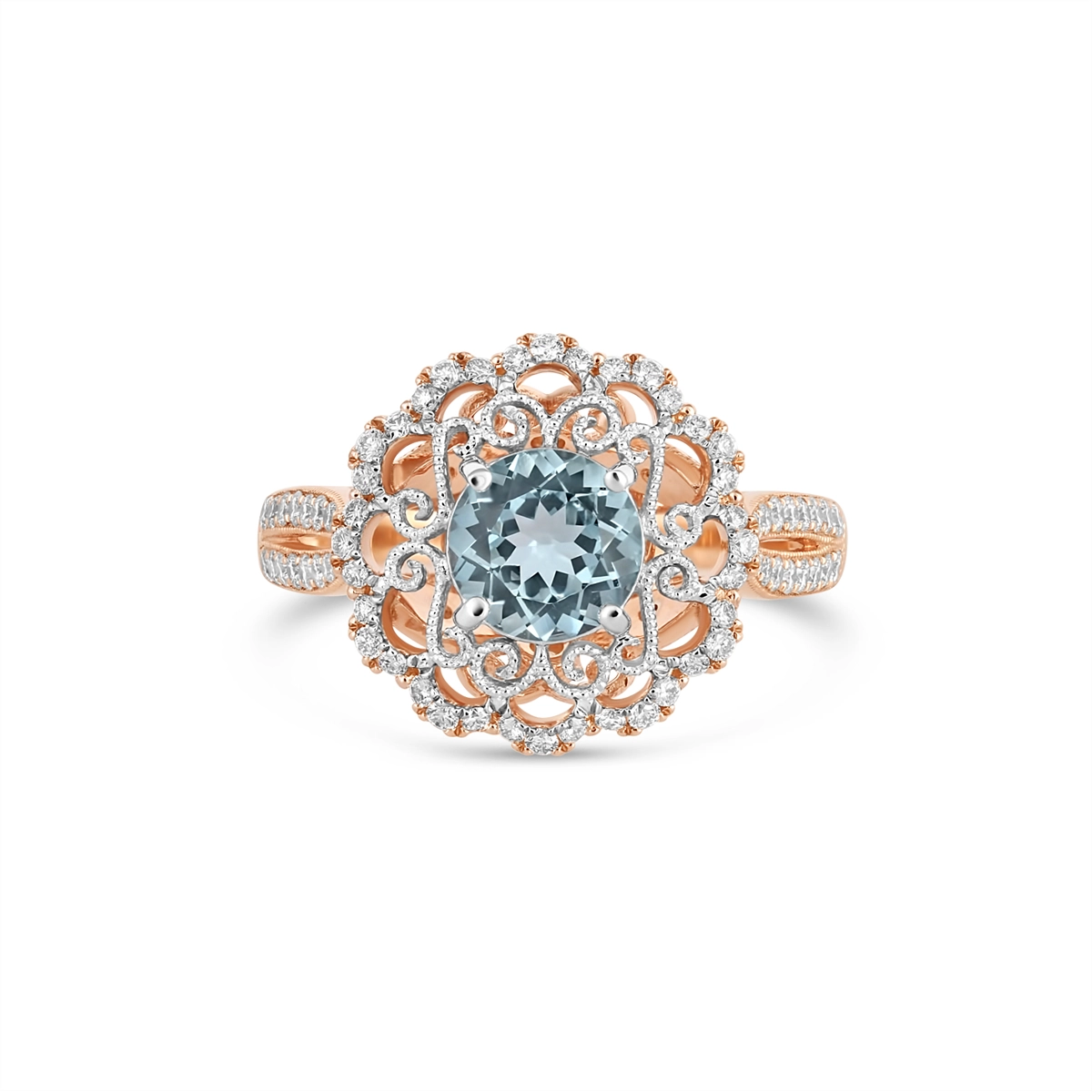 Ladies diamond ring in 14 karat rose and white gold. Set in the center in the ring is one 0.86 carat round aquamarine and 74 round brilliant cut diamonds with a total weight of 0.53 carat.
