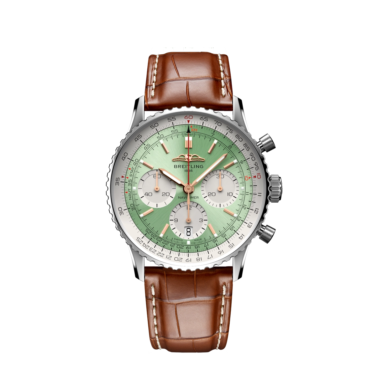 Breitling watch. Navitimer B01 Chronograph 41 in stainless steel case and bracelet. Synthetic sapphire crystal. 41mm case. Mint green dial with three subdials. Gold brown alligator leather strap with folding clasp. Swiss automatic movement. Date. Chronometer.