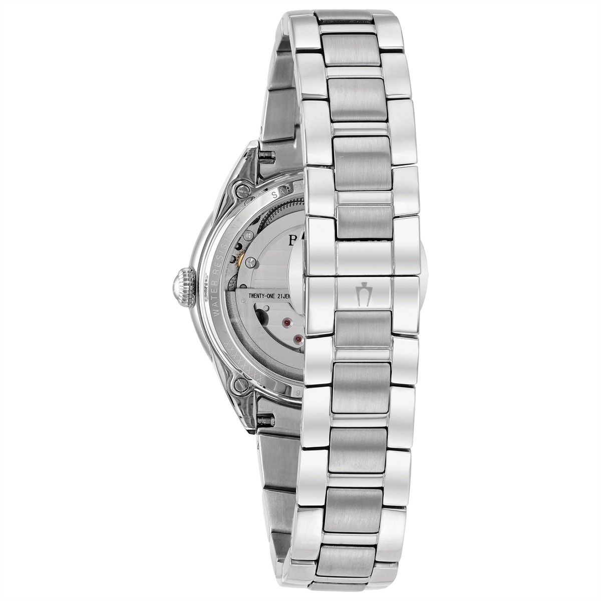Seiko Watch. Ladies' Sutton in stainless steel case and bracelet. Domed synthetic sapphire crystal. 34mm case. White mother-of-pearl dial with diamonds and cut-out. Automatic movement. Exhibition caseback.