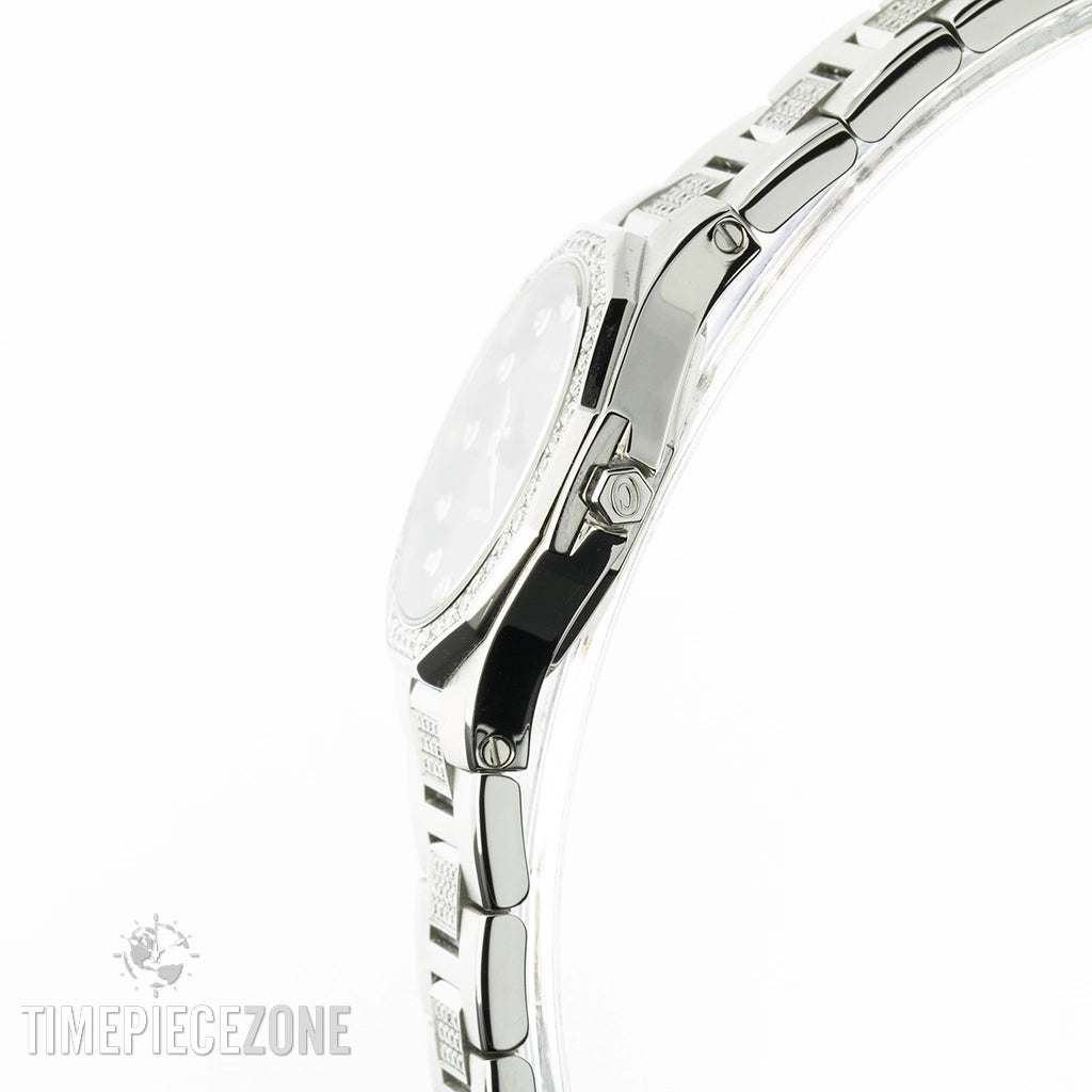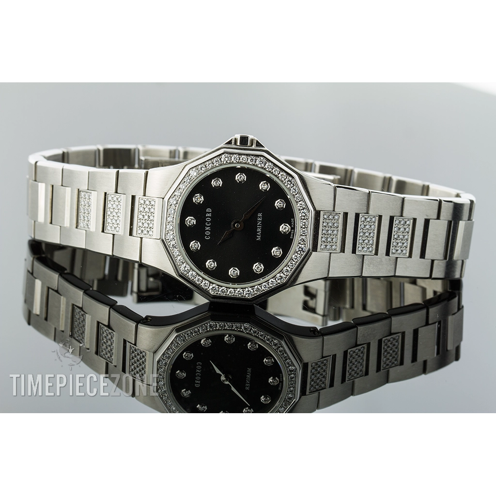 Ladies' Concord watch. Mariner in stainless steel case and bracelet. Synthetic sapphire crystal. 26mm case. Bezel and bracelet set with 138 diamonds. Black dial set with 12 diamonds. DIamonds average VVS in clarity. Swiss quartz movement.