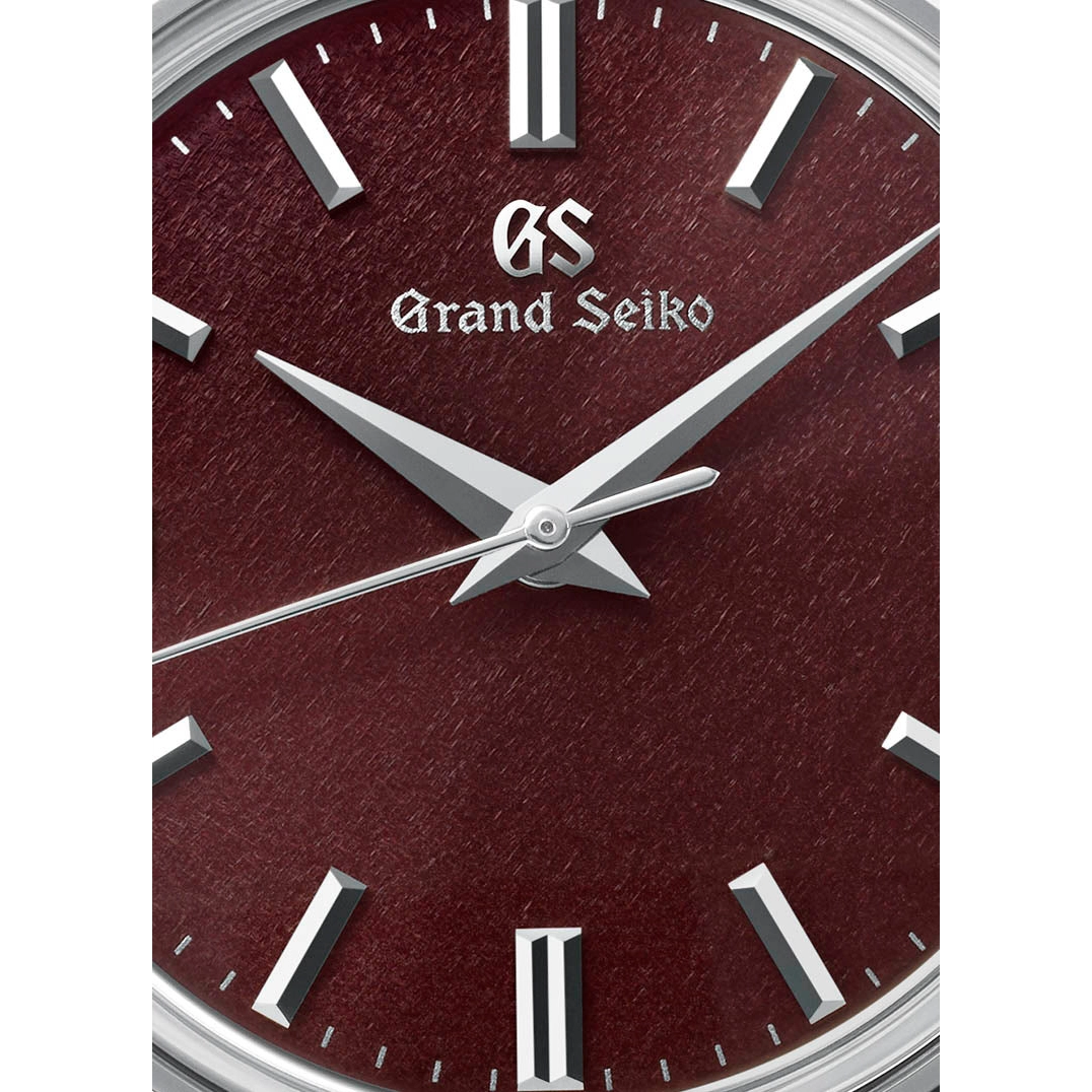 Grand Seiko watch. Elegance Collection Boshu. Synthetic sapphire crystal. 37.3mm case. Deep burgundy dial. Burgundy crocodile leather strap. Manual wind movement. 24 jewels. Approximately 72 hour power reserve. Exhibition caseback.
