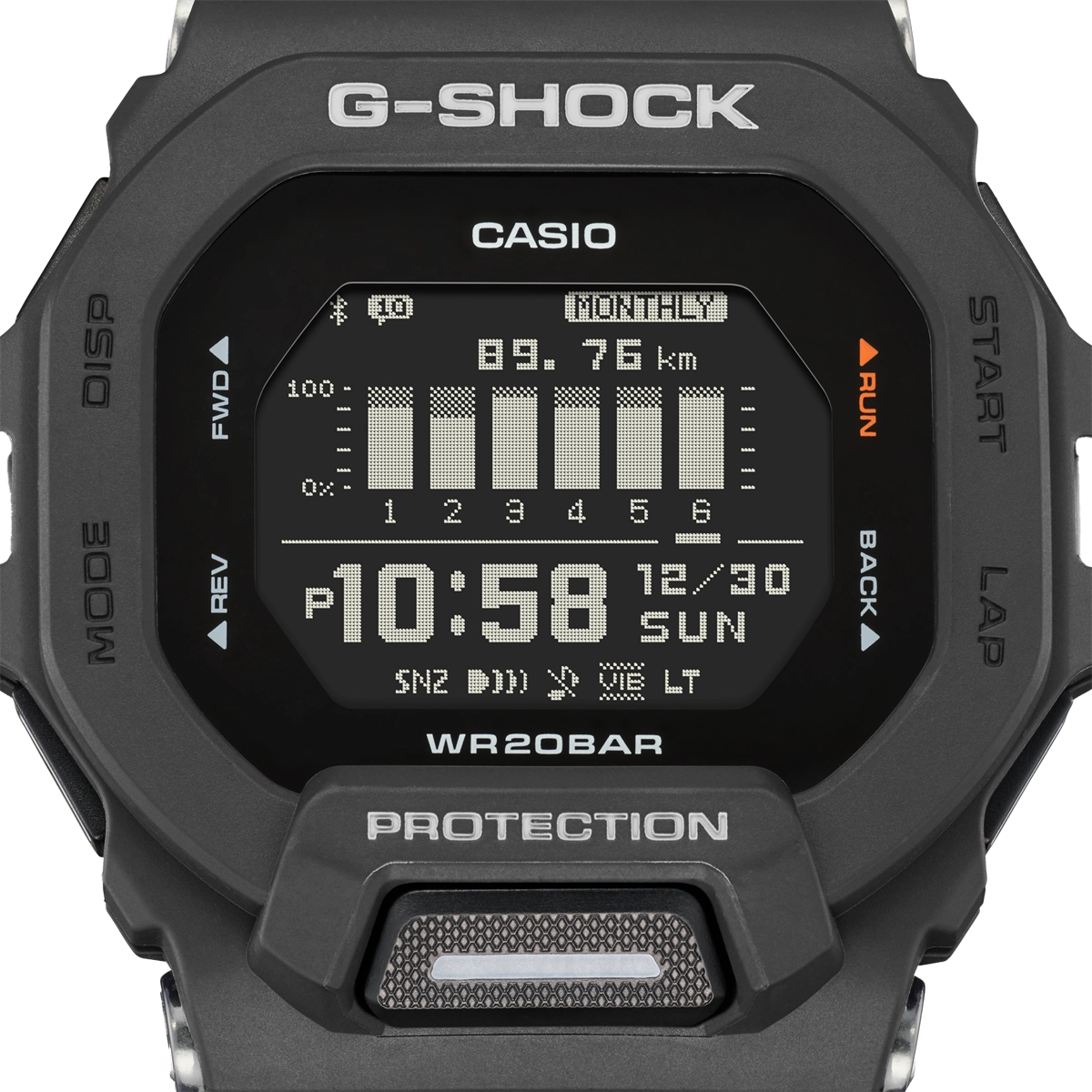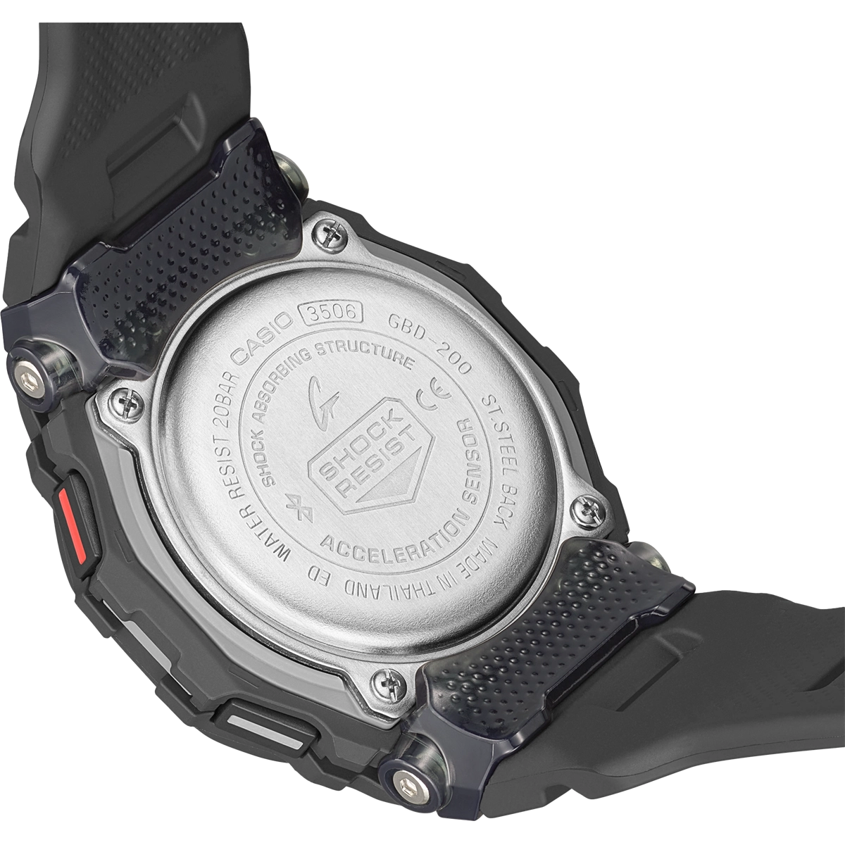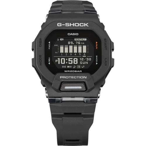 G-Shock watwch. Resin case and band. Mineral crystal. Training function. Mobile Link. LED backlight. World time. 38 time zones. Countdown timer. Vibration alert. 4 daily alarms with snooze. Power saving. 49.4 x 45.9 x 15mm case. Full auto-calender (until 2099).