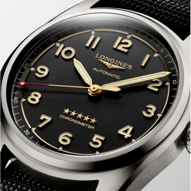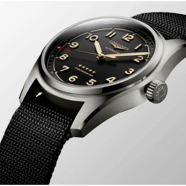 Longines watch. Spirit Titanium. Automatic watch. Anthracite dial. Arabic numerals. Black Nato strap. Self-winding movement with 72 hour power reserve. 40mm case diameter. Chronometer.