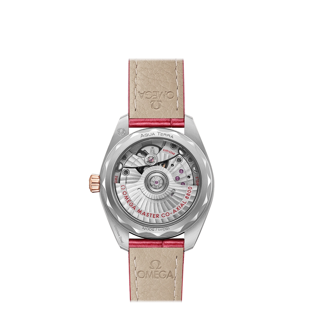 Omega watch. Seamaster Aqua Terra 150M in stainless steel 18 karat Sedna gold case. Synthetic sapphire crystal. 34mm case. Pale pink wave-embossed dial with hands in diamond-polished 18 karat Sedna gold and 11 marquise-cut ruby hour markers. Pink alligator strap. Full diamond bezel. Swiss co-axial automatic movement. Master chronometer. Date. Exhibition caseback. Date. Calibre 8800. 150M water resistance.