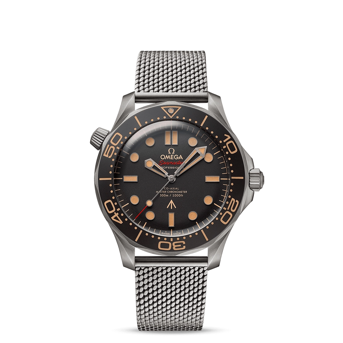 Omega watch. Seamaster 007 Edition. Diver 300M. Brown tropical aluminium bezel ring & dial. Grade 2 Titanium case & titanium bracelet. Self-winding. Synthetic sapphire crystal. 42mm case diameter.