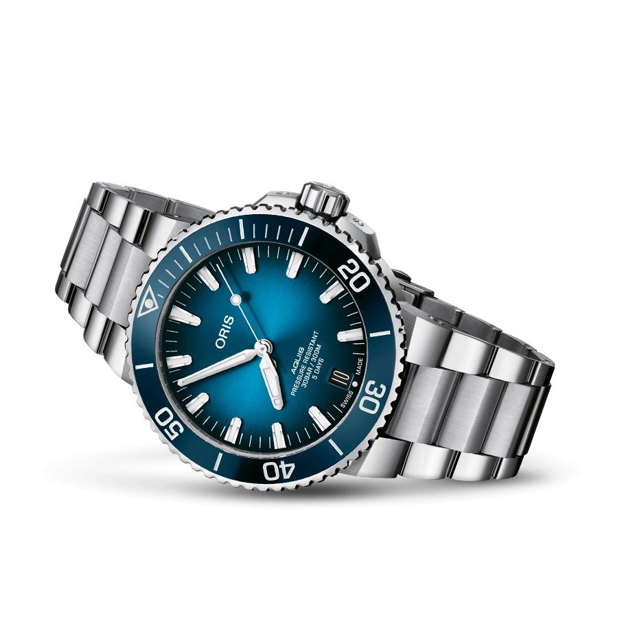 Oris watch. Aquis Date Caliber 400 in stainless steel case and bracelet. Synthetic sapphire crystal. 41.5mm case. Blue dial. Blue bezel. Swiss automatic movement. Date. Exhibition caseback.