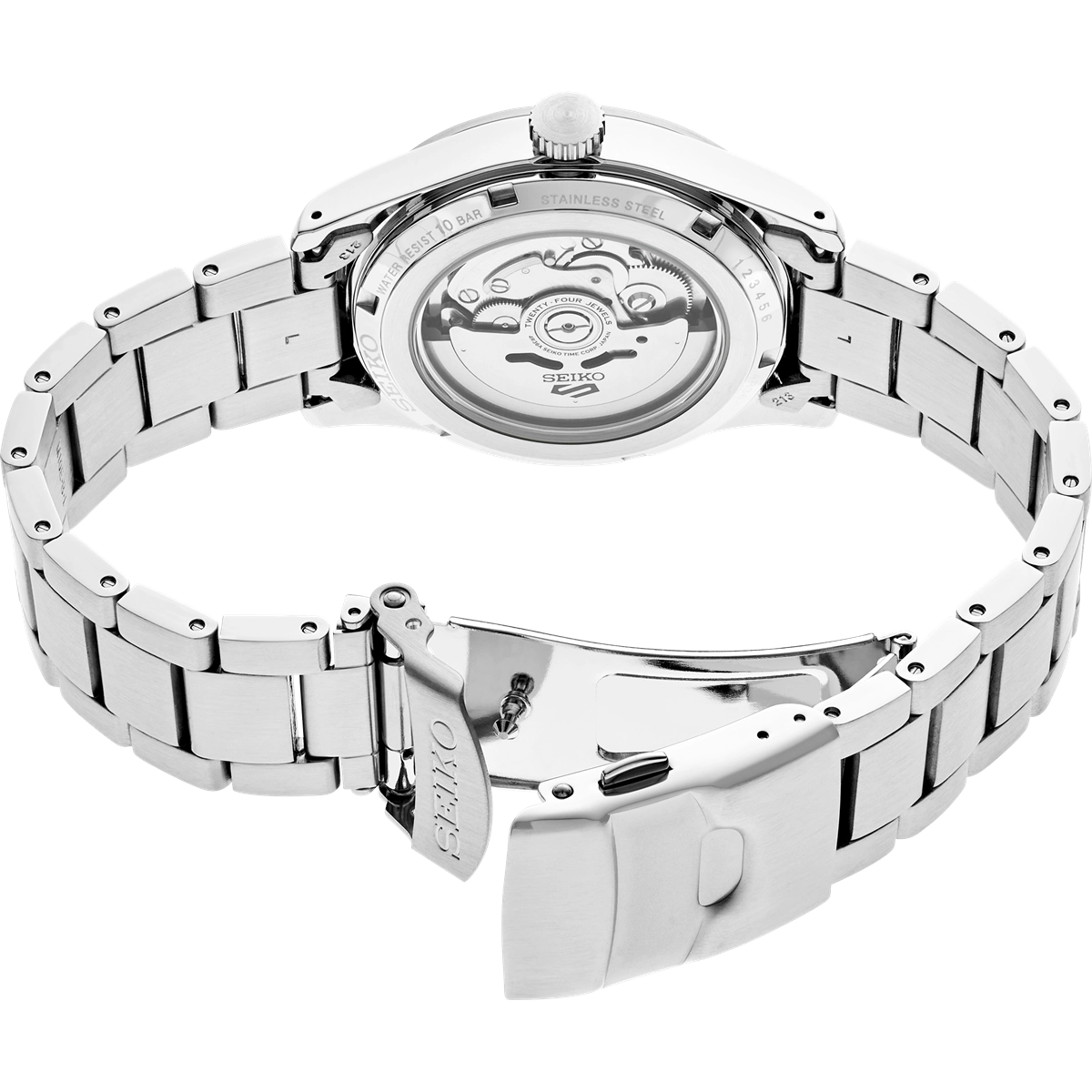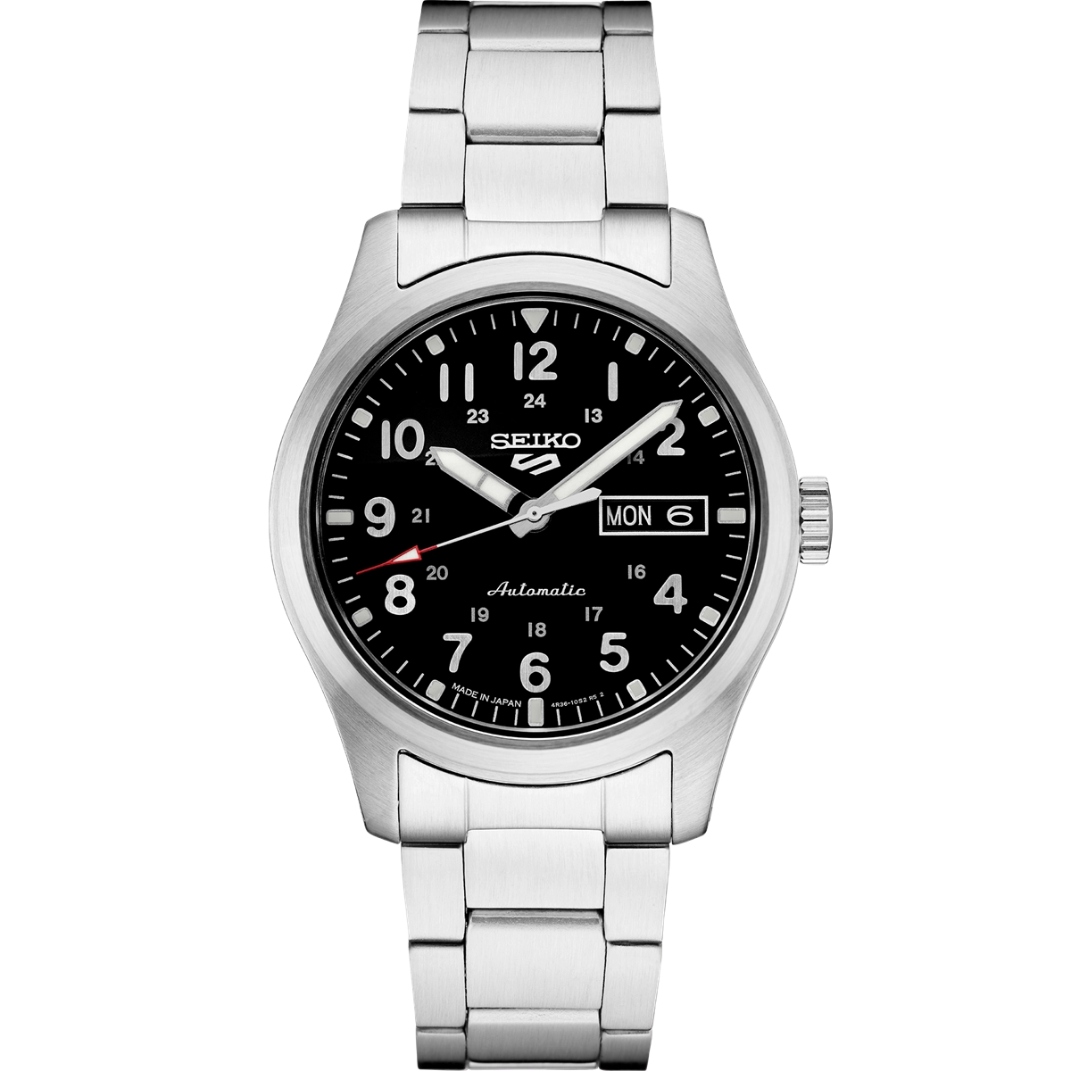 Seiko 5 Sports Collection in stainless steel case and bracelet. 39.4mm case. Black arabic dial. Automatic movement. Day-Date. Exhibition caseback. 24 jewels. Caliber 4R36. Approximately 41 hours power reserve.