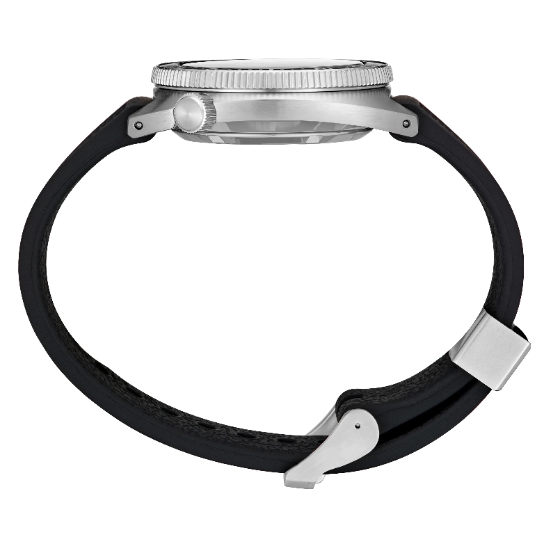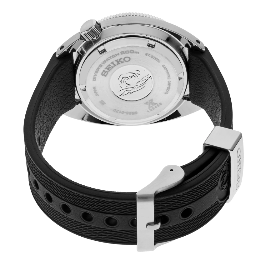 Seiko watch. Prospex Diver's in stainless steel case. Curved synthetic sapphire crystal. 41mm case. Black dial. Unidirectional rotatable black bezel. Black silcone strap with rail pattern. Automatic movement. Date. Caliber 6R35. 24 jewels. Approximately 70 hour power reserve.