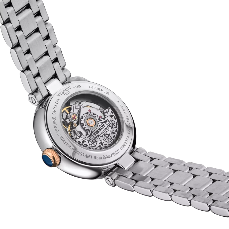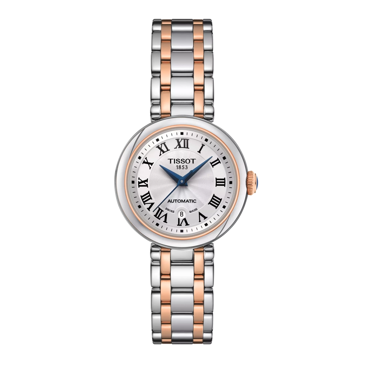 Tissot watch. Classic Traditional collection. Bellissima. 29mm case diameter. Stainless steel and rose gold PVD coating case and bracelet. Synthetic sapphire crystal. See-through caseback. White dial. Date. Swiss automatic movement.