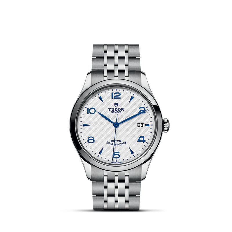 TUDOR watch. 1926 in stainless steel case and bracelet. Synthetic sapphire crystal. 39mm case. Opaline and blue embossed dial. Smooth bezel. Self-winding mechanical movement, Calibre T601. Approximately 38 hour power reserve. Date.