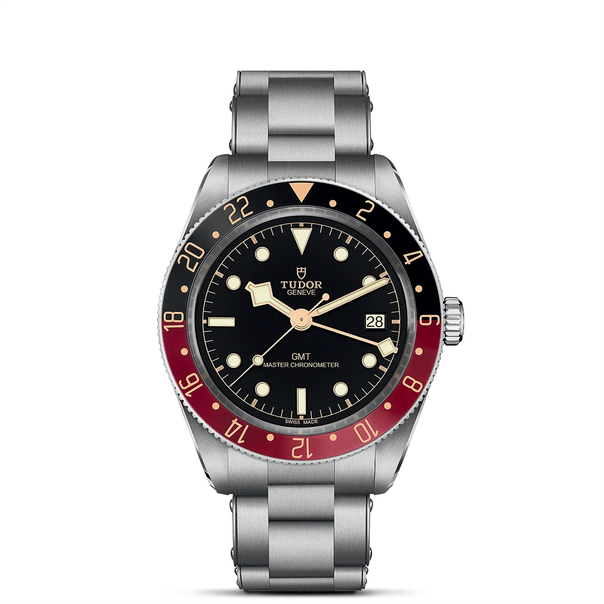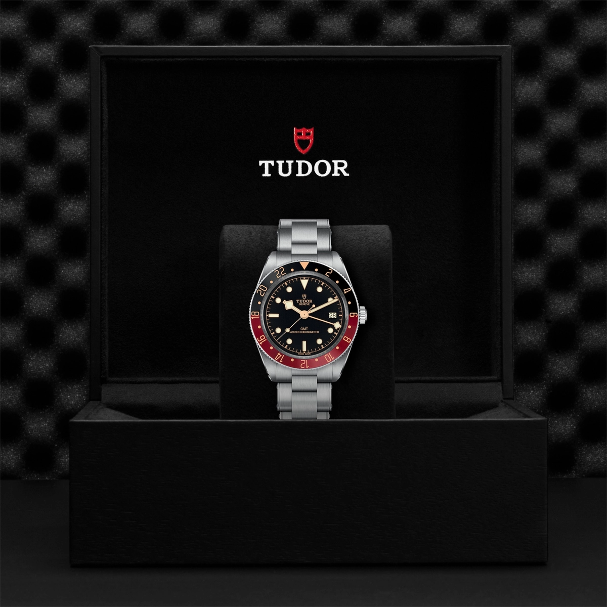TUDOR watch. Black Bay 58 GMT. 39mm stainless steel case with polished and satin finishes. 24-hour bidirectional rotatable bezel in stainless steel with black and burgundy anodised aluminium insert. Manufacture Calibre MT5450-U (COSC and METAS certified) Self-winding mechanical movement with bidirectional rotor system Integrated GMT function. Black, domed dial with gilt applied hour markers. Stainless steel screw-down winding crown with the TUDOR rose in relief. Domed sapphire crystal. Waterproof to 200m (660 ft). 3-link “rivet-style” stainless steel bracelet with polished and satin finishes with TUDOR “T-fit” clasp. Date.