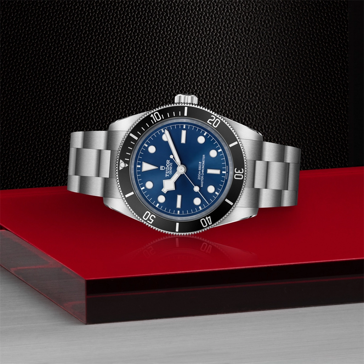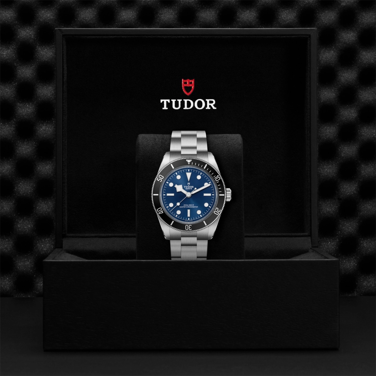 TUDOR watch. Black Bay 68. 43mm stainless steel case with polished and satin finishes. 60-minute unidirectional bezel in stainless steel with matte black aluminium insert. Manufacture Calibre MT5601-U Self-winding mechanical movement with bidirectional rotor system. Sun-brushed TUDOR Blue, domed, with applied hour markers. Stainless steel screw-down crown with the TUDOR rose in relief. Domed sapphire crystal. 3-link stainless steel bracelet with smooth side flanks and polished and satin finishes, with TUDOR “T-fit” clasp. Waterproof to 200M/660 feet.