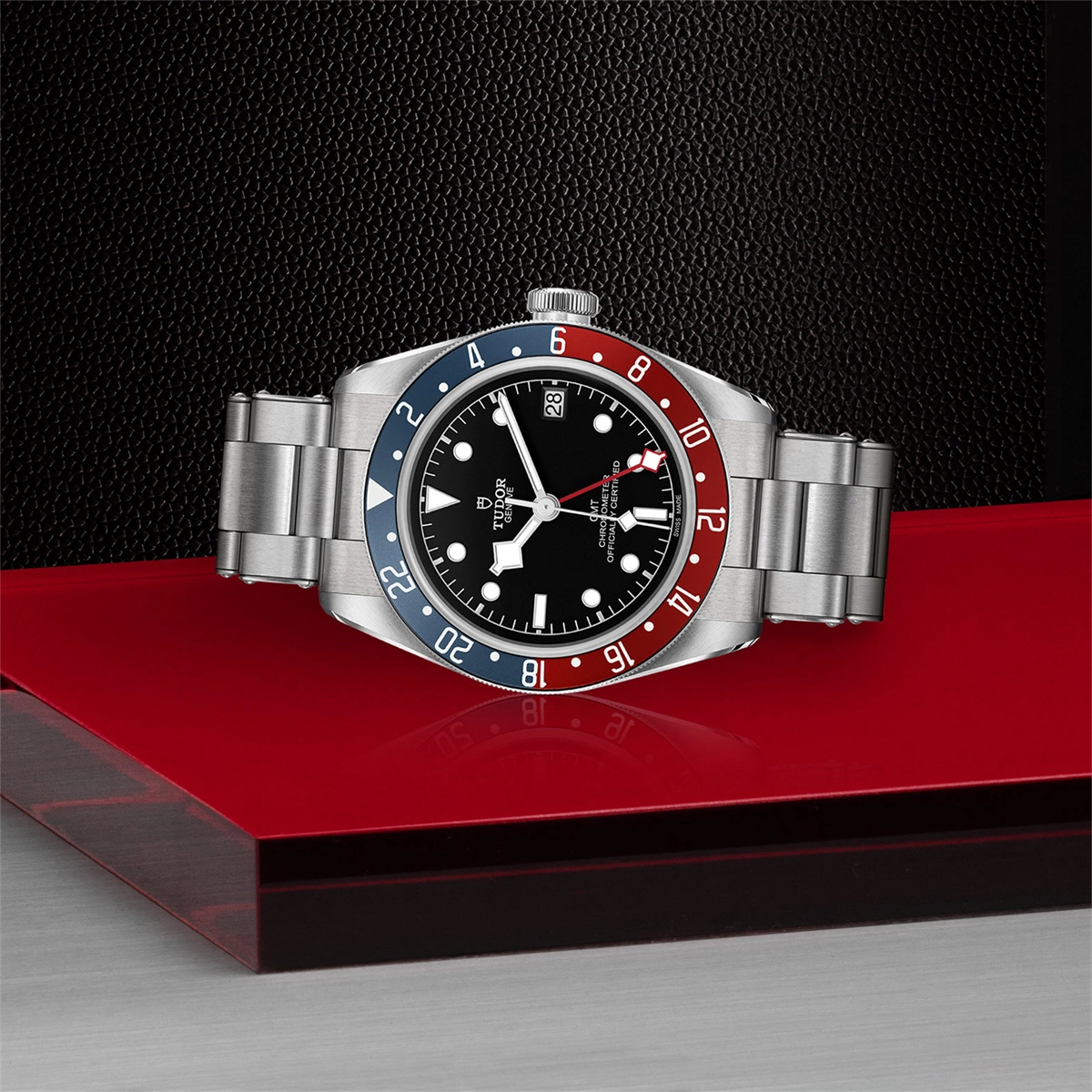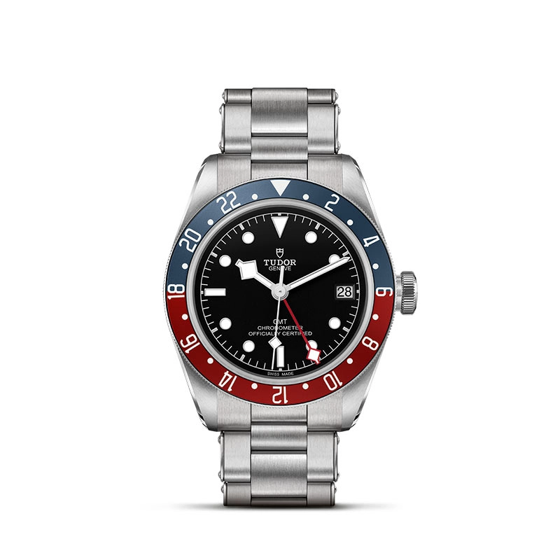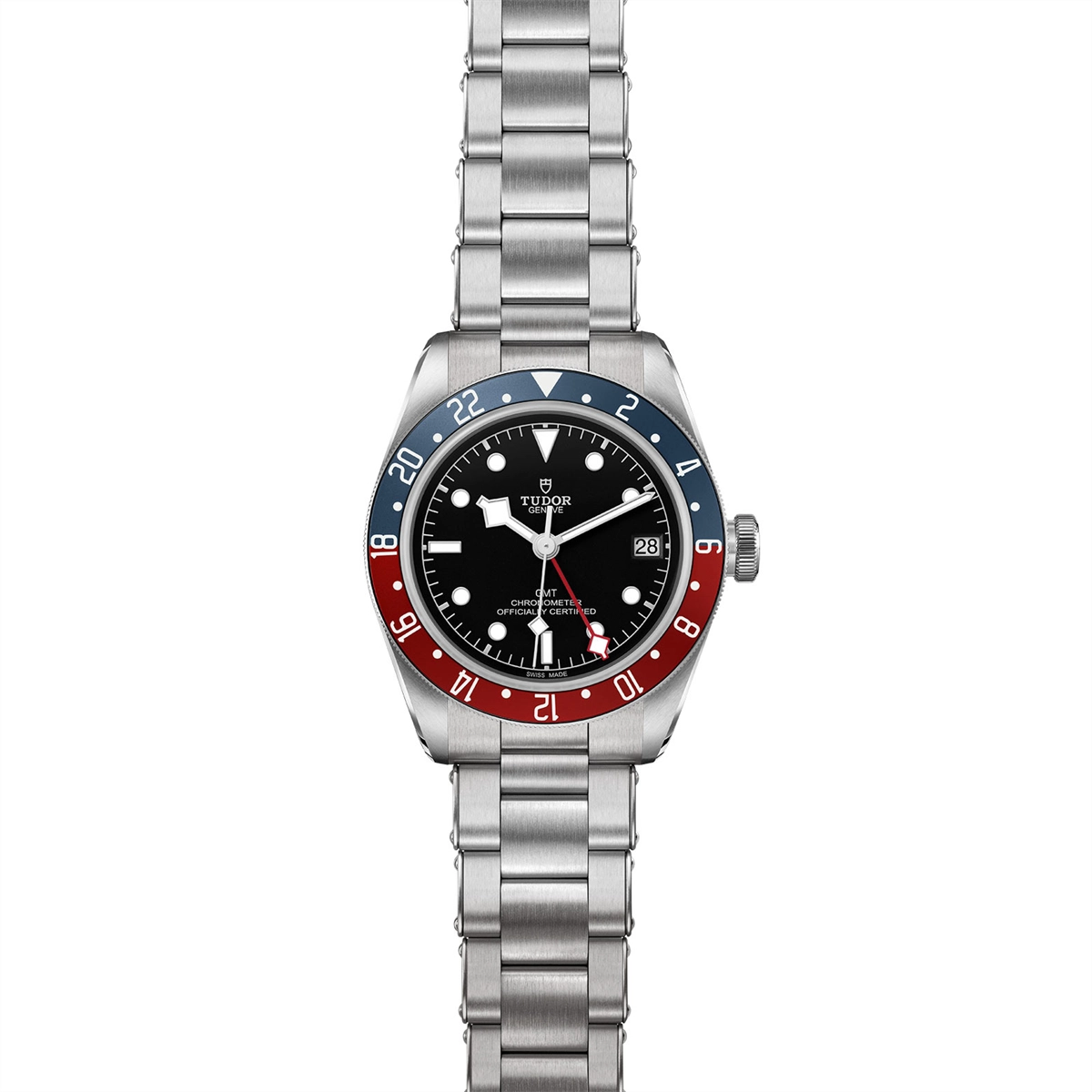 Tudor Watch. Black Bay GMT in stainless steel case and bracelet. Synthetic sapphire crystal. 41mm case. Black dial. Blue and red bezel. Self-winding movement with bidirectional rotor system. Manufacture Calibre MT5652. Approximately 70 hour power reserve. Date. GMT. Chronometer.